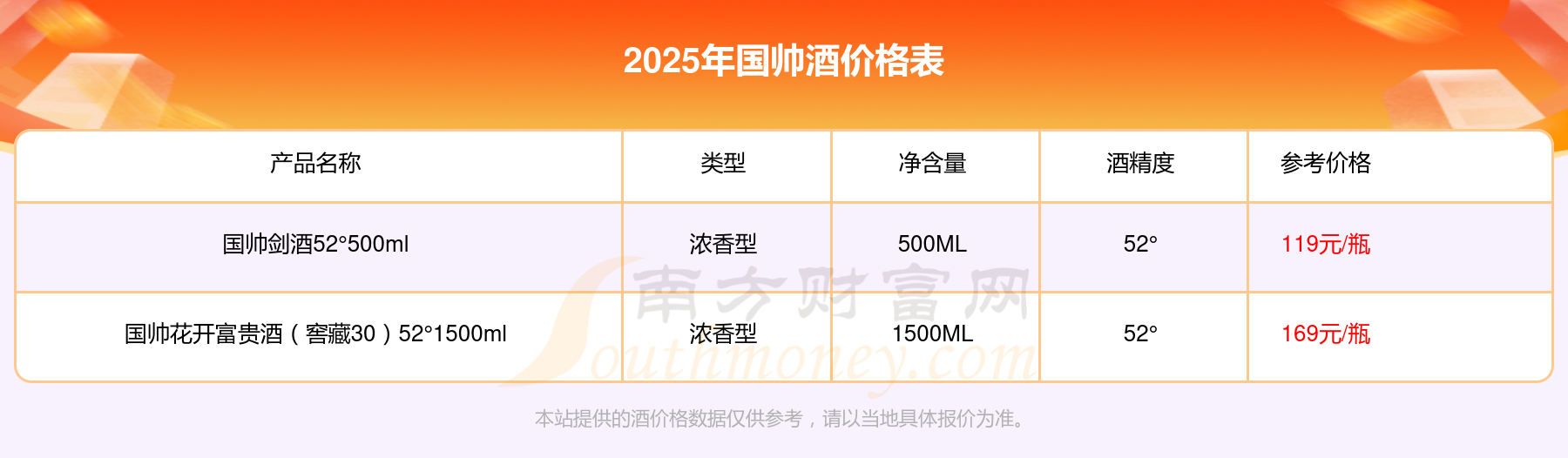 2025年,國帥花開富貴酒(窖藏30)52°1500ml、國帥劍酒52°500ml等國帥酒價格如下: