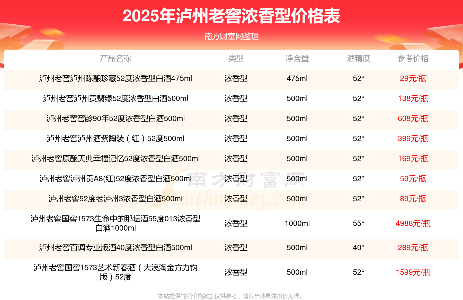 2025年,瀘州老窖國(guó)窖1573春釀鼠兆豐年E 55度、瀘州老窖國(guó)窖1573生命中的那壇酒55度014、瀘州老窖國(guó)窖1573春釀鼠兆豐年A 55度等瀘州老窖濃香型酒價(jià)格如下:瀘州老窖國(guó)窖1573春釀鼠兆豐年E 55度參考價(jià)17999元/瓶、瀘州老窖國(guó)窖1573生命中的那壇酒55度014參考價(jià)9999元/瓶、瀘州老窖國(guó)窖1573春釀鼠兆豐年A 55度參考價(jià)5088元/瓶。