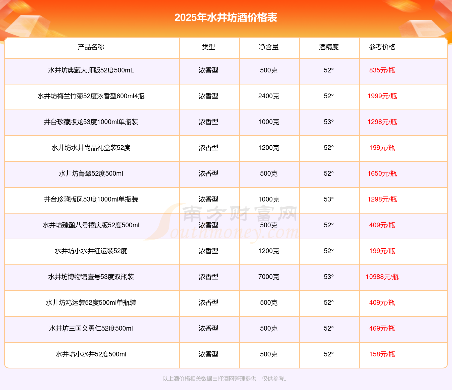 水井坊酒最新價(jià)格2025:水井坊大壇收藏級(jí)原漿天球瓶66度參考價(jià)13999元/瓶、水井坊博物館壹號(hào)53度雙瓶裝參考價(jià)10988元/瓶、53°水井坊公元十三600ml參考價(jià)2580元/瓶、水井坊梅蘭竹菊52度濃香型600ml4瓶參考價(jià)1999元/瓶、水井坊菁翠52度500ml參考價(jià)1650元/瓶。
