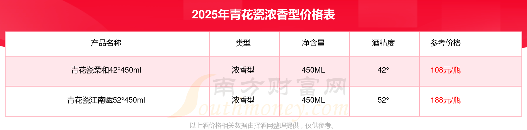 2025年,青花瓷濃香型酒價(jià)格最高的是青花瓷江南賦52°450ml,參考價(jià)188元,最低的是青花瓷柔和42°450ml,參考價(jià)108元,價(jià)格高低差為80元。
