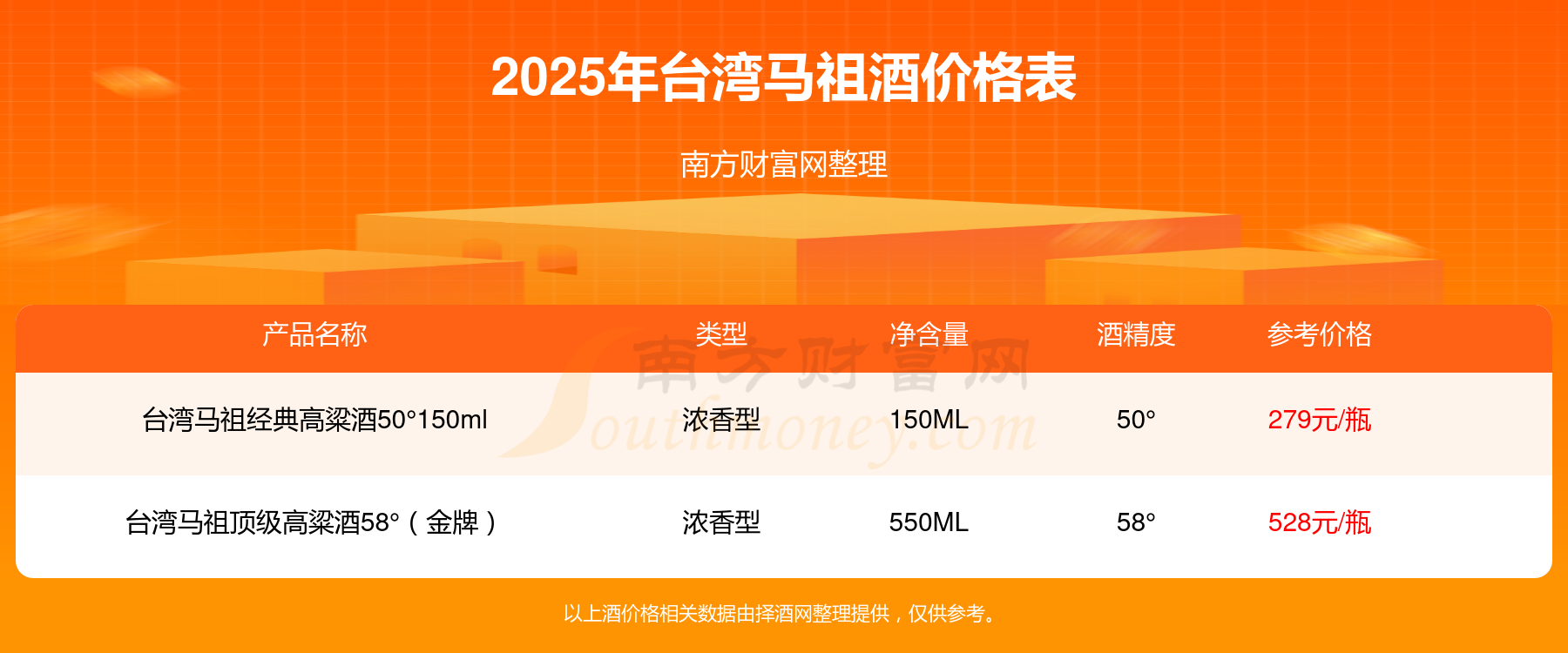 2025臺灣馬祖酒最新價格:臺灣馬祖頂級高粱酒58°(金牌)參考價528元/瓶、臺灣馬祖經(jīng)典高粱酒50°150ml參考價279元/瓶。