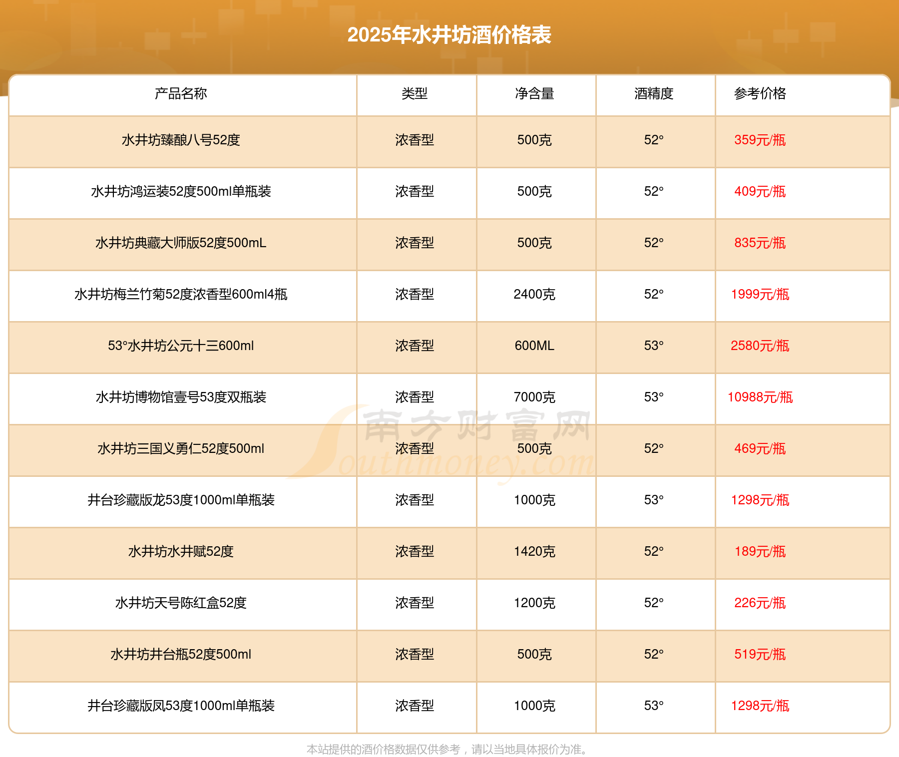 2025水井坊酒最新價格:水井坊大壇收藏級原漿天球瓶66度參考價13999元/瓶、水井坊博物館壹號53度雙瓶裝參考價10988元/瓶、53°水井坊公元十三600ml參考價2580元/瓶、水井坊梅蘭竹菊52度濃香型600ml4瓶參考價1999元/瓶、水井坊菁翠52度500ml參考價1650元/瓶、井臺珍藏版龍53度1000ml單瓶裝參考價1298元/瓶、井臺珍藏版鳳53度1000ml單瓶裝參考價1298元/瓶。