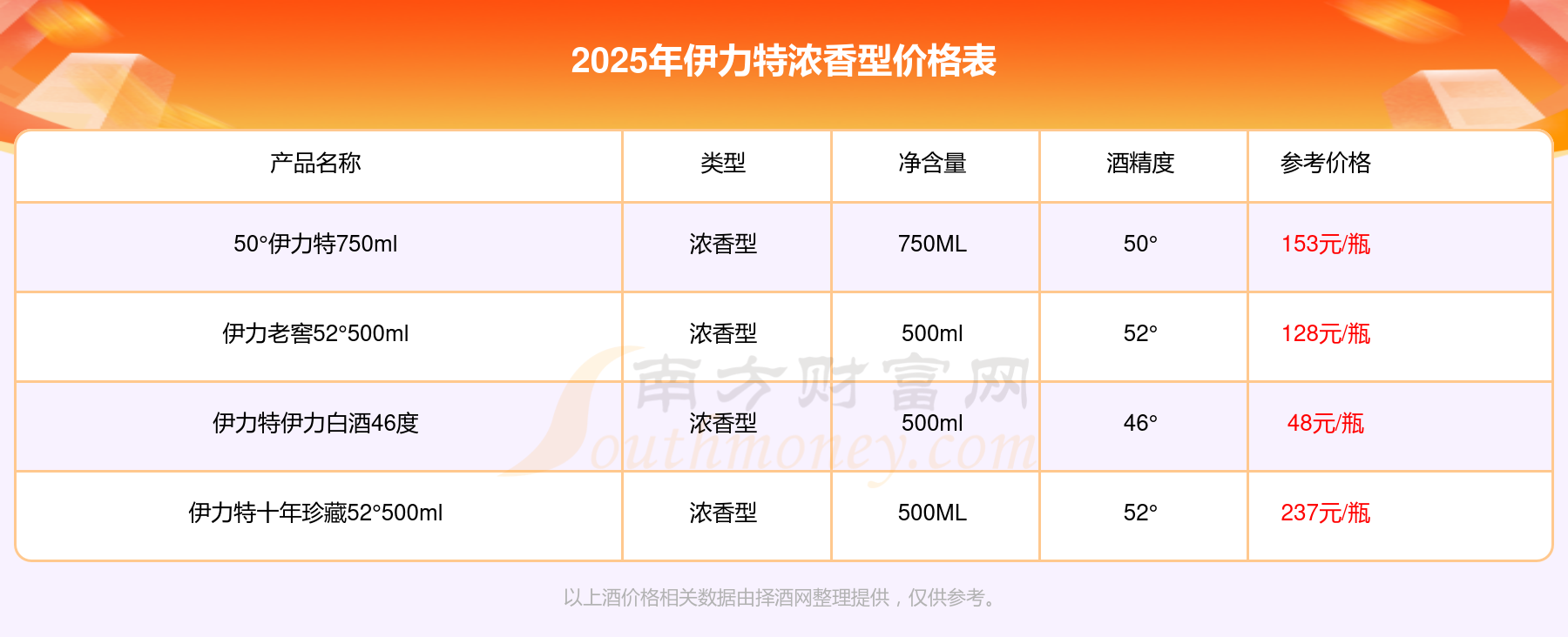 伊力特濃香型酒最新價格2025:伊力特十年珍藏52°500ml參考價237元/瓶、50°伊力特750ml參考價153元/瓶、伊力老窖52°500ml參考價128元/瓶、伊力特伊力白酒46度參考價48元/瓶。