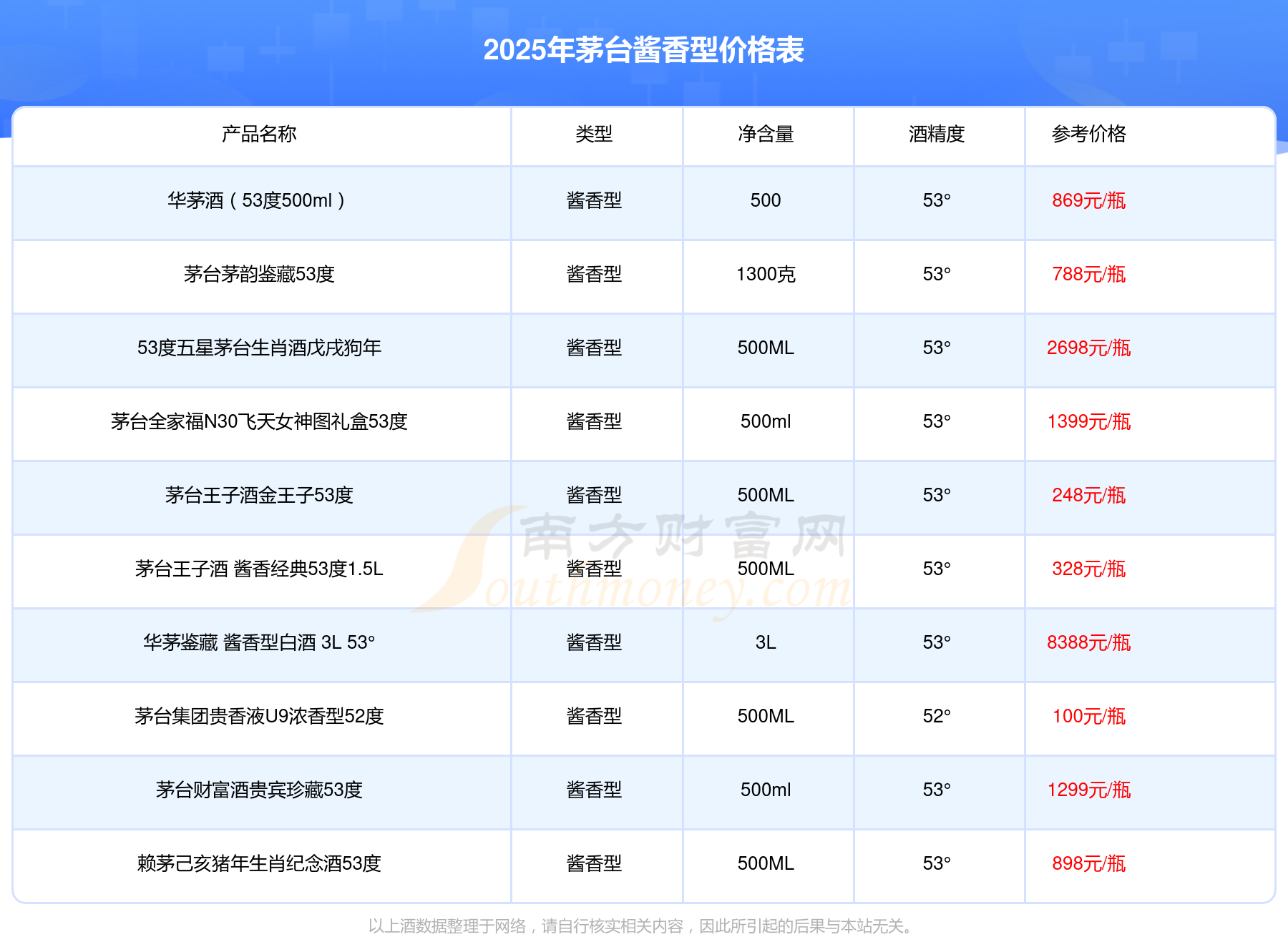 華茅鑒藏 醬香型白酒 3L 53°參考價8388元/瓶、53度五星茅臺生肖酒丁酉雞年參考價2798元/瓶、貴州茅臺己亥豬年生肖酒53°500ml參考價2699元/瓶、53度五星茅臺生肖酒戊戌狗年參考價2698元/瓶、飛天茅臺53°500ml(2015年)參考價2199元/瓶、茅臺王子酒己亥豬年生肖紀念酒53度2.5L參考價2099元/瓶。