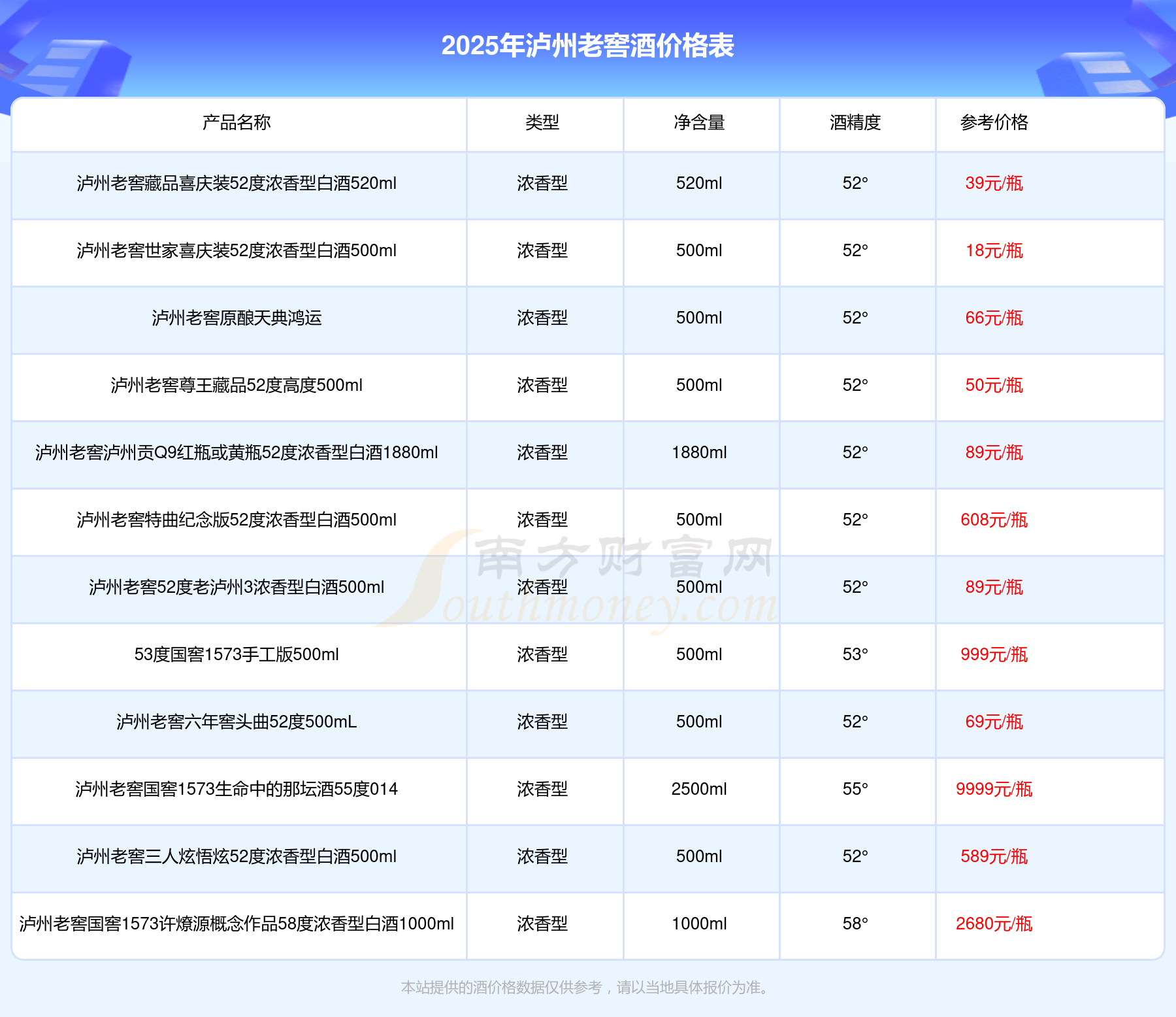 瀘州老窖酒最新價格2025:瀘州老窖國窖1573春釀鼠兆豐年E 55度參考價17999元/瓶、瀘州老窖國窖1573生命中的那壇酒55度014參考價9999元/瓶、瀘州老窖國窖1573春釀鼠兆豐年A 55度參考價5088元/瓶。