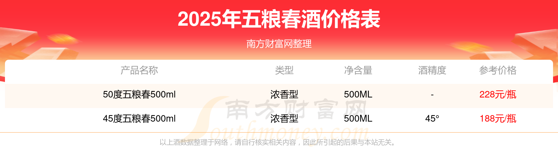 2025年五糧春酒50度五糧春500ml、45度五糧春500ml等最新價(jià)格如下:50度五糧春500ml參考價(jià)228元/瓶、45度五糧春500ml參考價(jià)188元/瓶。