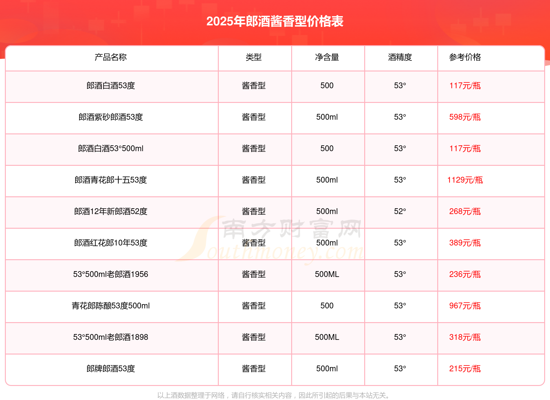 郎酒青花郎十五53度參考價(jià)1129元/瓶、青花郎陳釀53度500ml參考價(jià)967元/瓶、郎酒紫砂郎酒53度參考價(jià)598元/瓶、郎酒紅花郎10年53度參考價(jià)389元/瓶、53°500ml老郎酒1898參考價(jià)318元/瓶、郎酒12年新郎酒52度參考價(jià)268元/瓶。