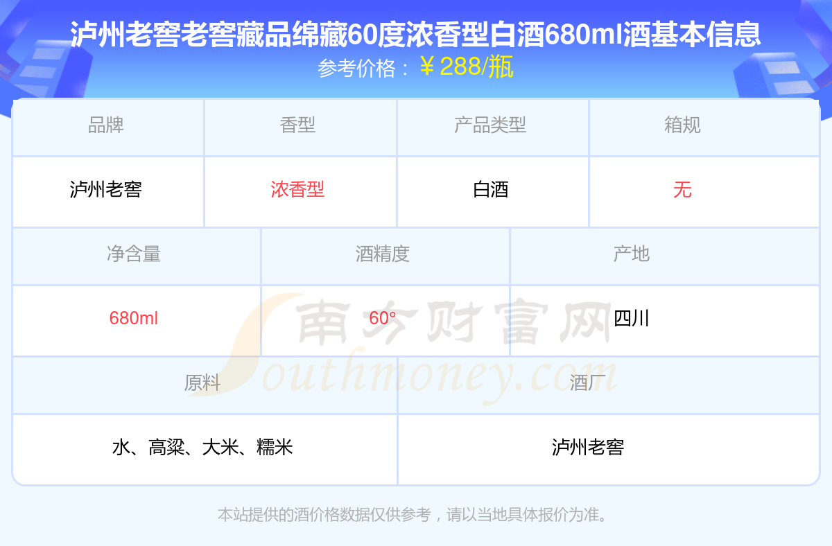 瀘州老窖老窖藏品綿藏60度濃香型白酒680ml基本信息