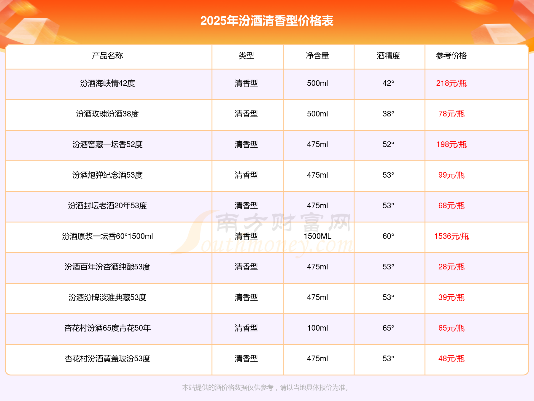 2025汾酒清香型酒最新價格:汾酒原漿一壇香60°3000ml參考價2180元/瓶、汾酒原漿一壇香60°1500ml參考價1536元/瓶、42度汾酒青花25參考價598元/瓶、汾酒收藏系列盤古汾酒55度參考價400元/瓶。