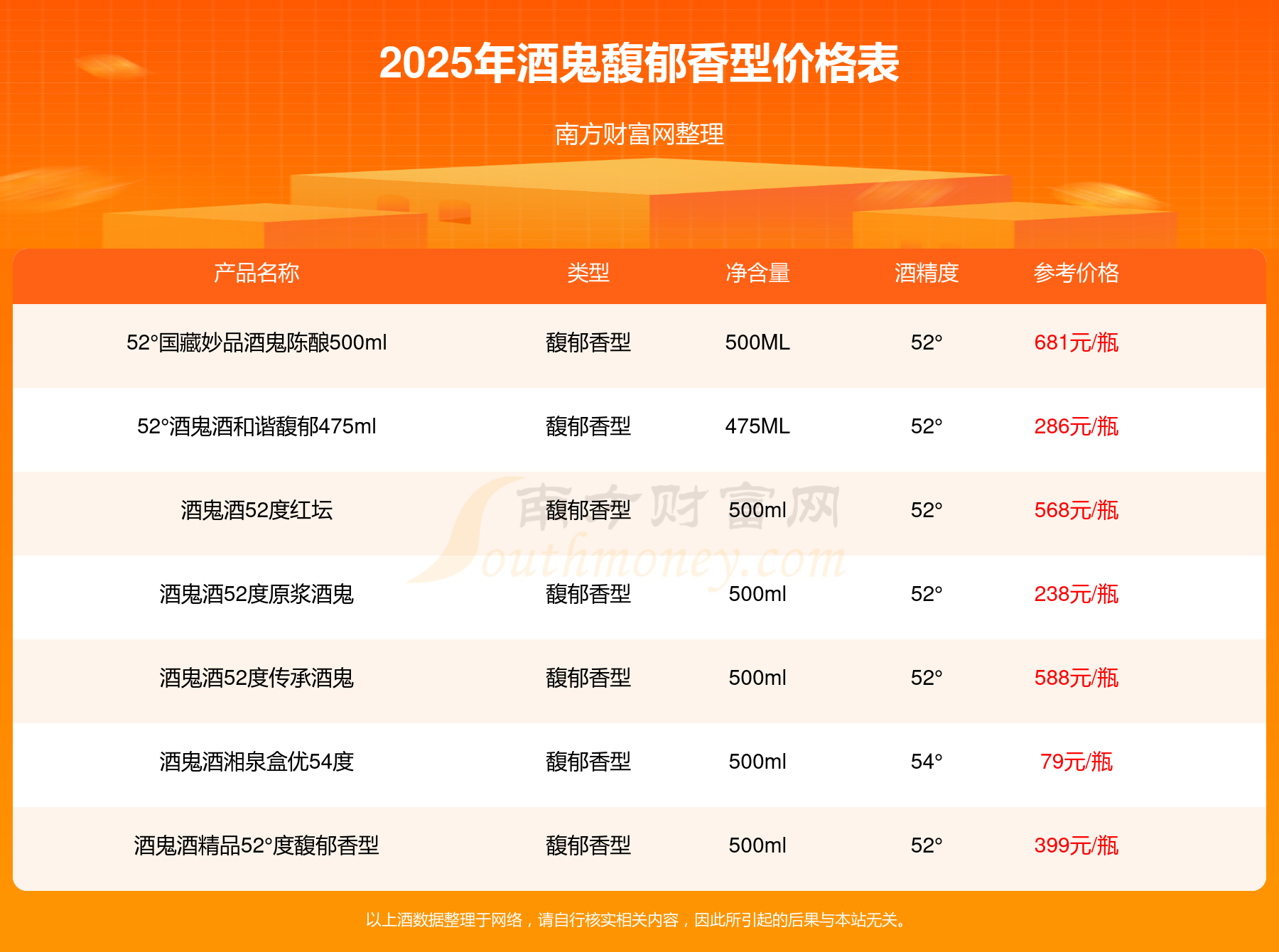 52°國藏妙品酒鬼陳釀500ml參考價681元/瓶、酒鬼酒52度傳承酒鬼參考價588元/瓶、酒鬼酒52度紅壇參考價568元/瓶、酒鬼酒精品52°度馥郁香型參考價399元/瓶、52°酒鬼酒和諧馥郁475ml參考價286元/瓶。