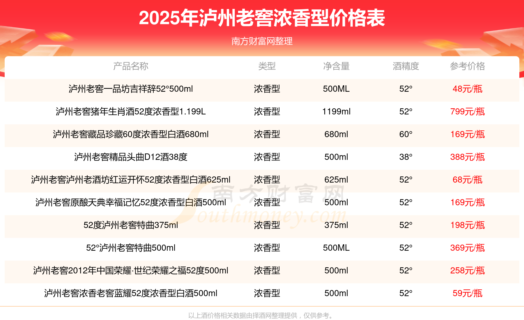 瀘州老窖濃香型酒最新價(jià)格2025:瀘州老窖國(guó)窖1573春釀鼠兆豐年E 55度參考價(jià)17999元/瓶、瀘州老窖國(guó)窖1573生命中的那壇酒55度014參考價(jià)9999元/瓶、瀘州老窖國(guó)窖1573春釀鼠兆豐年A 55度參考價(jià)5088元/瓶、瀘州老窖國(guó)窖1573生命中的那壇酒55度013濃香型白酒1000ml參考價(jià)4988元/瓶、瀘州老窖國(guó)窖1573生命中的那壇酒55度009 1000ml參考價(jià)4288元/瓶、瀘州老窖國(guó)窖1573中國(guó)品味52度濃香型白酒500ml參考價(jià)2888元/瓶、瀘州老窖國(guó)窖1573許燎源概念作品58度濃香型白酒1000ml參考價(jià)2680元/瓶、瀘州老窖52度國(guó)窖1573狗年生肖禮盒參考價(jià)2143元/瓶。
