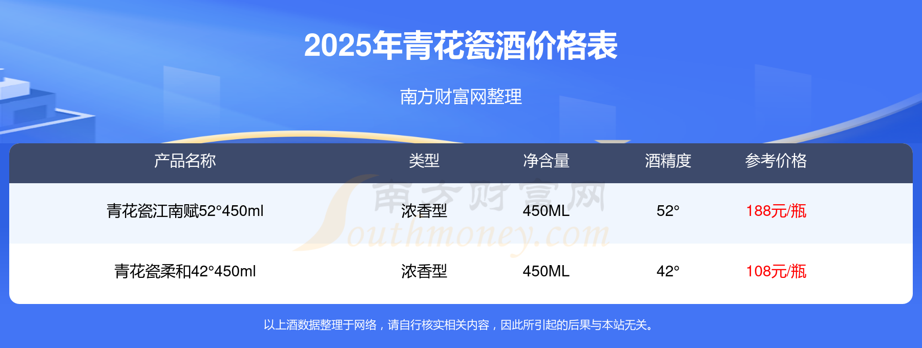青花瓷江南賦52°450ml參考價(jià)188元/瓶、青花瓷柔和42°450ml參考價(jià)108元/瓶。
