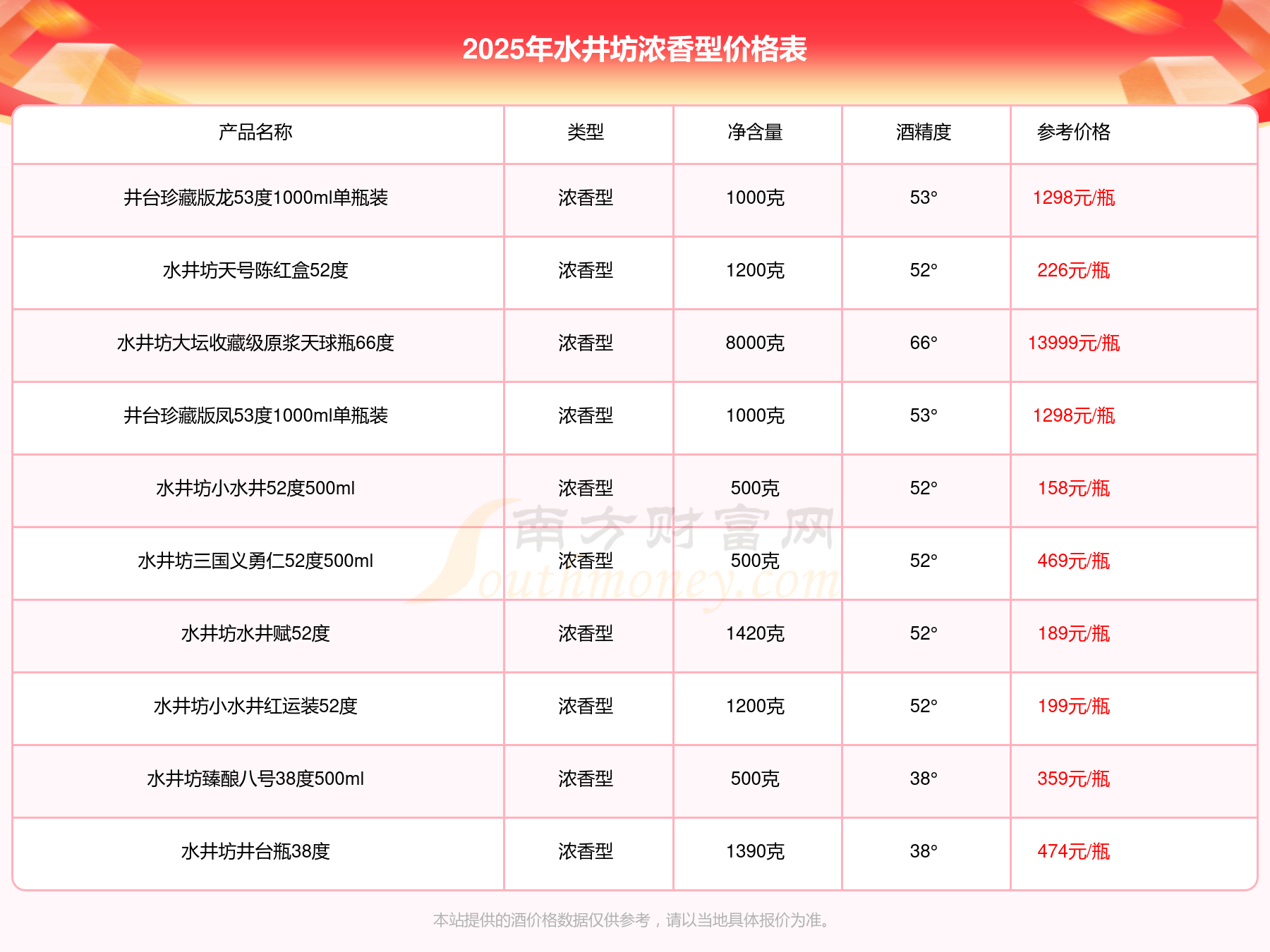 水井坊大壇收藏級原漿天球瓶66度參考價13999元/瓶、水井坊博物館壹號53度雙瓶裝參考價10988元/瓶、53°水井坊公元十三600ml參考價2580元/瓶、水井坊梅蘭竹菊52度濃香型600ml4瓶參考價1999元/瓶、水井坊菁翠52度500ml參考價1650元/瓶、井臺珍藏版龍53度1000ml單瓶裝參考價1298元/瓶、井臺珍藏版鳳53度1000ml單瓶裝參考價1298元/瓶、53°水晶水井坊500ml參考價898元/瓶。