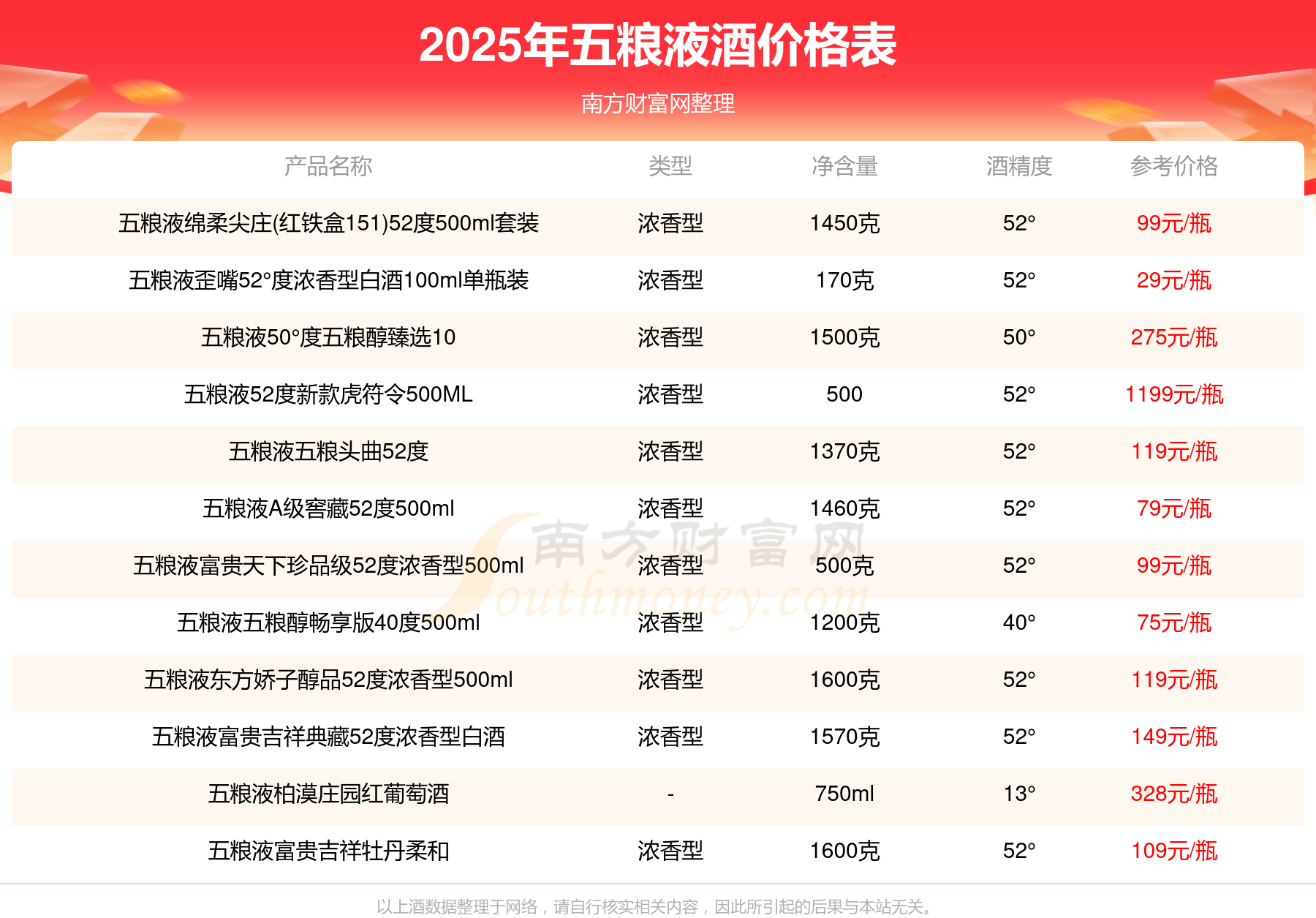 五糧液酒價格最高的是五糧液百年世博世紀(jì)榮耀紀(jì)念酒60°999ml,參考價26980元/瓶,最低的是五糧液干一杯小瓶46度,參考價16元/瓶,價格高低差為26964元/瓶。