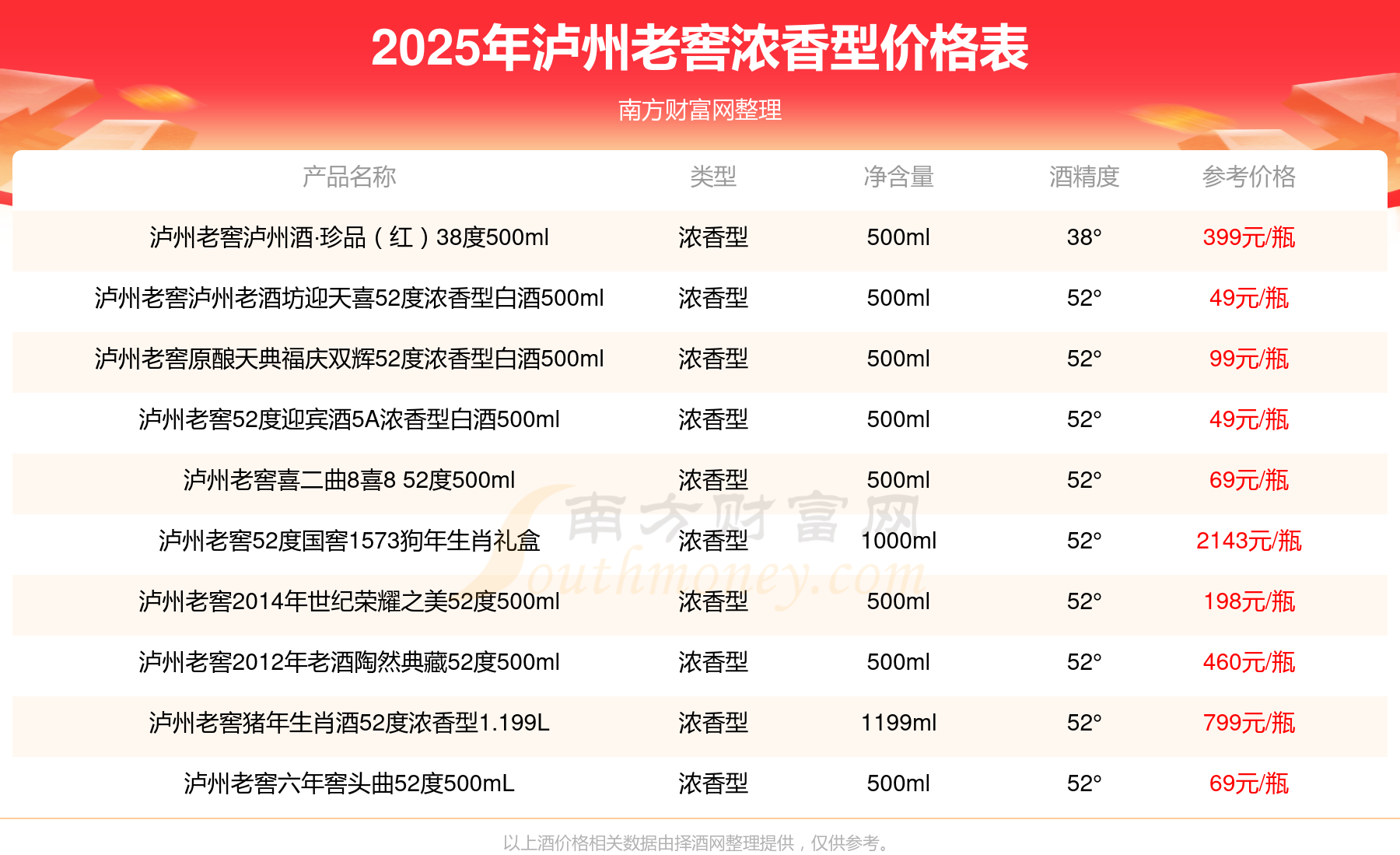 2025瀘州老窖濃香型酒最新價格:瀘州老窖國窖1573春釀鼠兆豐年E 55度參考價17999元/瓶、瀘州老窖國窖1573生命中的那壇酒55度014參考價9999元/瓶、瀘州老窖國窖1573春釀鼠兆豐年A 55度參考價5088元/瓶。