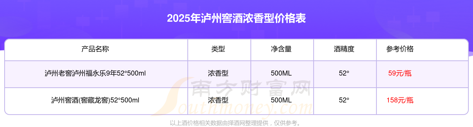 2025瀘州窖酒濃香型酒最新價格:瀘州窖酒(窖藏龍窖)52°500ml參考價158元/瓶、瀘州老窖瀘州福永樂9年52°500ml參考價59元/瓶。