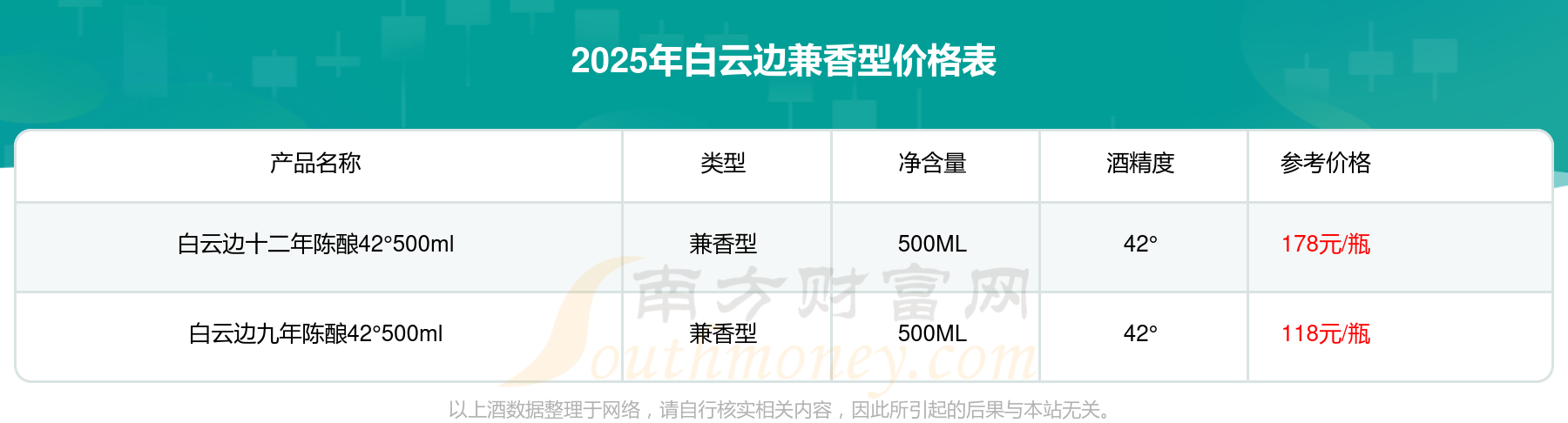 2025年白云邊兼香型酒白云邊十二年陳釀42°500ml、白云邊九年陳釀42°500ml等最新價(jià)格如下: