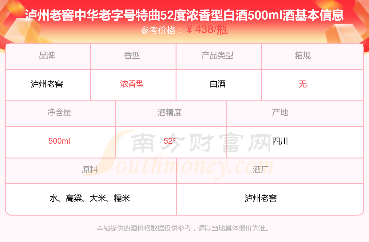 瀘州老窖中華老字號特曲52度濃香型白酒500ml基本信息