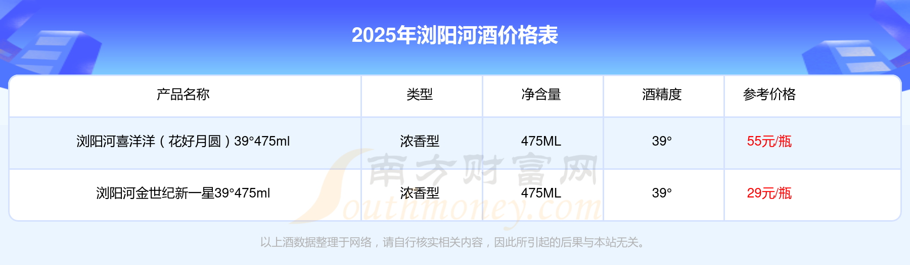瀏陽河喜洋洋(花好月圓)39°475ml參考價55元/瓶、瀏陽河金世紀(jì)新一星39°475ml參考價29元/瓶。
