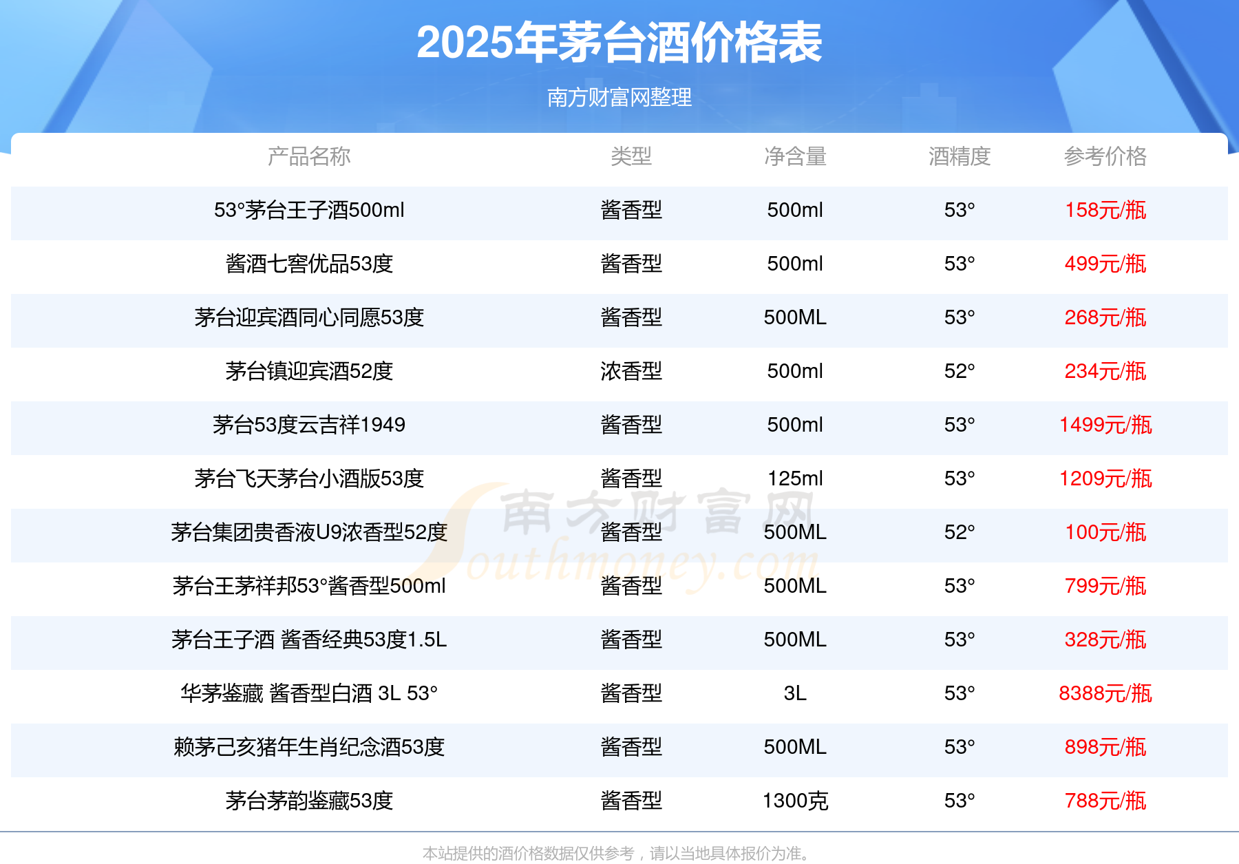 2025年,華茅鑒藏 醬香型白酒 3L 53°、53度五星茅臺生肖酒丁酉雞年、貴州茅臺己亥豬年生肖酒53°500ml、53度五星茅臺生肖酒戊戌狗年、飛天茅臺53°500ml(2015年)、茅臺王子酒己亥豬年生肖紀(jì)念酒53度2.5L、茅臺1935醬香型53度、茅臺財富貴賓典藏酒53度等茅臺酒價格如下:華茅鑒藏 醬香型白酒 3L 53°參考價8388元/瓶、53度五星茅臺生肖酒丁酉雞年參考價2798元/瓶、貴州茅臺己亥豬年生肖酒53°500ml參考價2699元/瓶、53度五星茅臺生肖酒戊戌狗年參考價2698元/瓶、飛天茅臺53°500ml(2015年)參考價2199元/瓶、茅臺王子酒己亥豬年生肖紀(jì)念酒53度2.5L參考價2099元/瓶、茅臺1935醬香型53度參考價1799元/瓶、茅臺財富貴賓典藏酒53度參考價1599元/瓶。