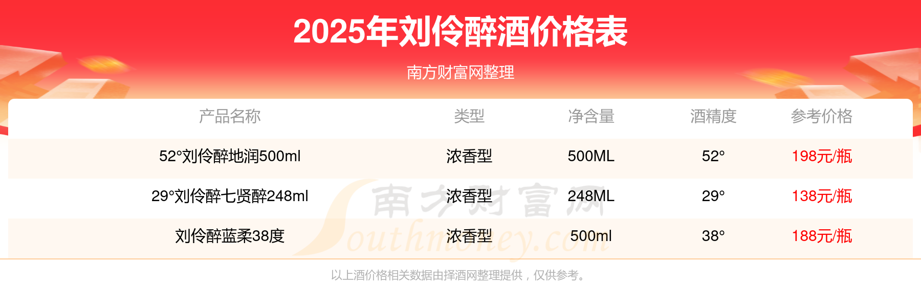 52°劉伶醉地潤500ml參考價198元/瓶、劉伶醉藍柔38度參考價188元/瓶、29°劉伶醉七賢醉248ml參考價138元/瓶。