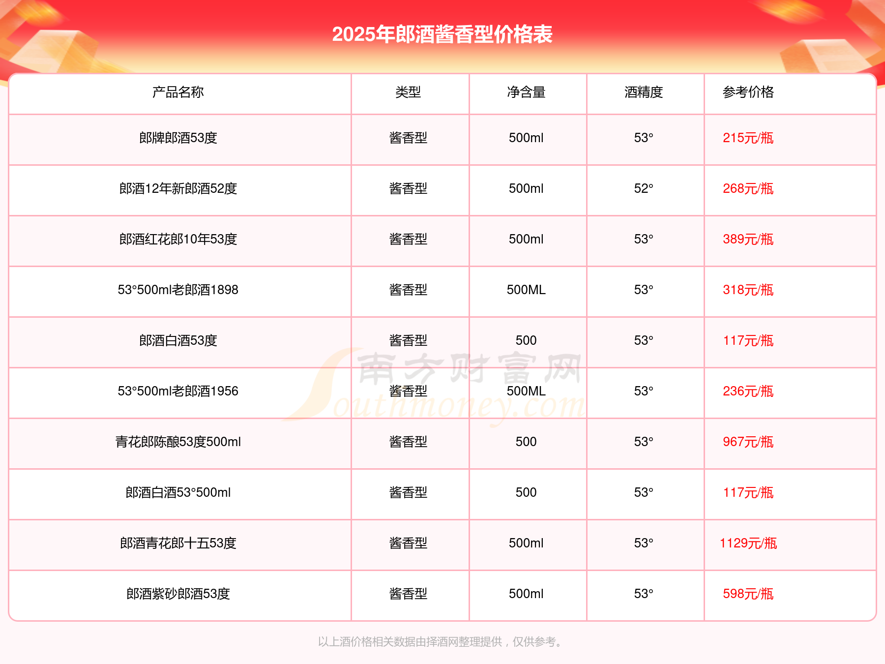 2025年郎酒醬香型酒郎酒青花郎十五53度、青花郎陳釀53度500ml、郎酒紫砂郎酒53度等最新價格如下:郎酒青花郎十五53度參考價1129元/瓶、青花郎陳釀53度500ml參考價967元/瓶、郎酒紫砂郎酒53度參考價598元/瓶。