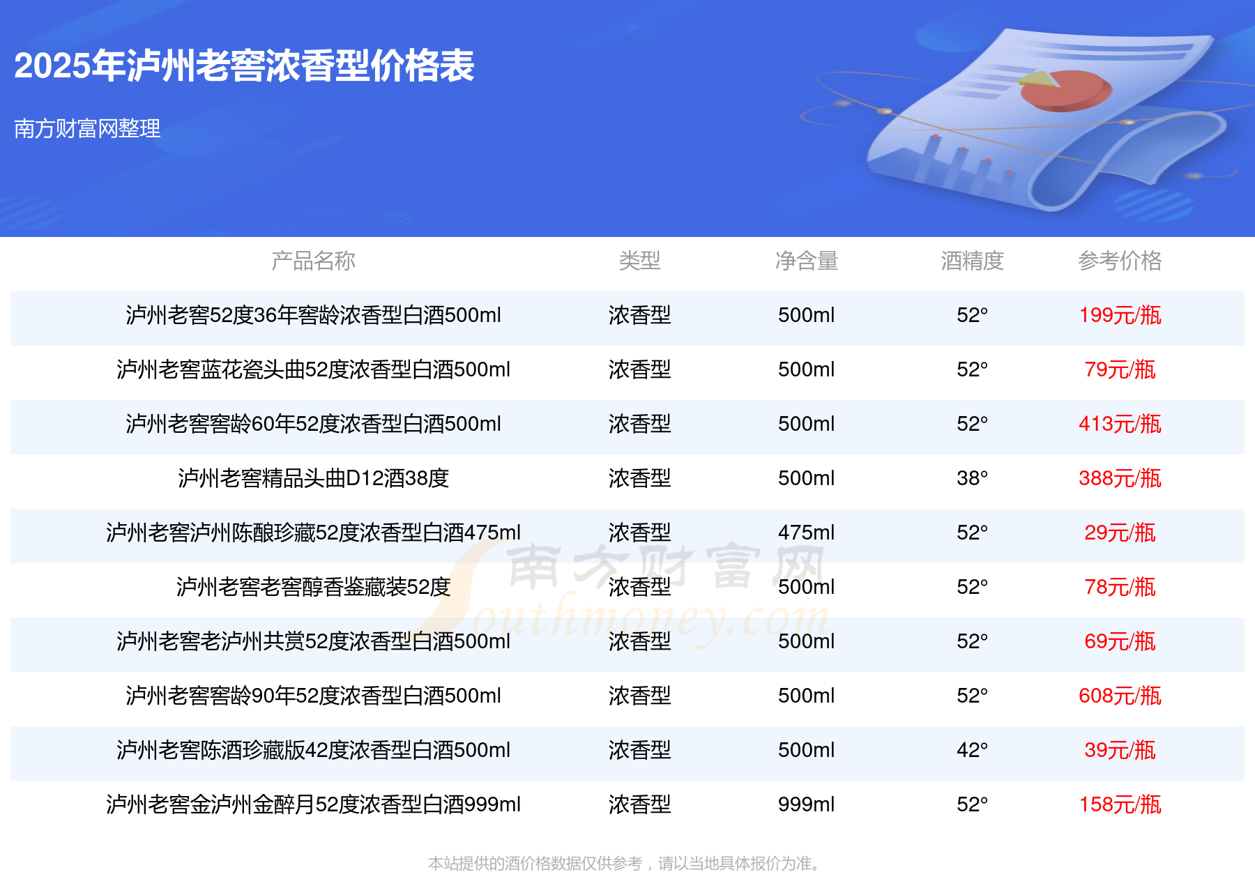 2025瀘州老窖濃香型酒最新價格:瀘州老窖國窖1573春釀鼠兆豐年E 55度參考價17999元/瓶、瀘州老窖國窖1573生命中的那壇酒55度014參考價9999元/瓶、瀘州老窖國窖1573春釀鼠兆豐年A 55度參考價5088元/瓶、瀘州老窖國窖1573生命中的那壇酒55度013濃香型白酒1000ml參考價4988元/瓶、瀘州老窖國窖1573生命中的那壇酒55度009 1000ml參考價4288元/瓶。