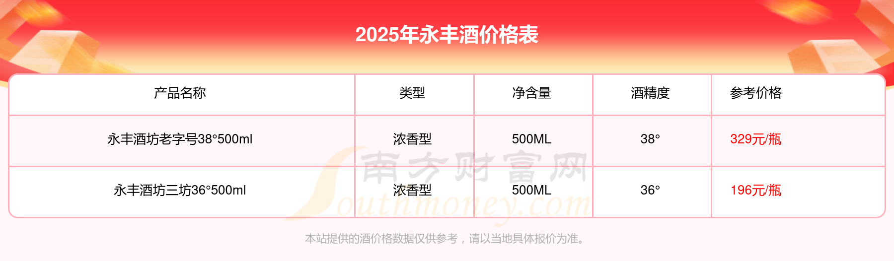 2025年永豐酒永豐酒坊老字號(hào)38°500ml、永豐酒坊三坊36°500ml等最新價(jià)格如下: