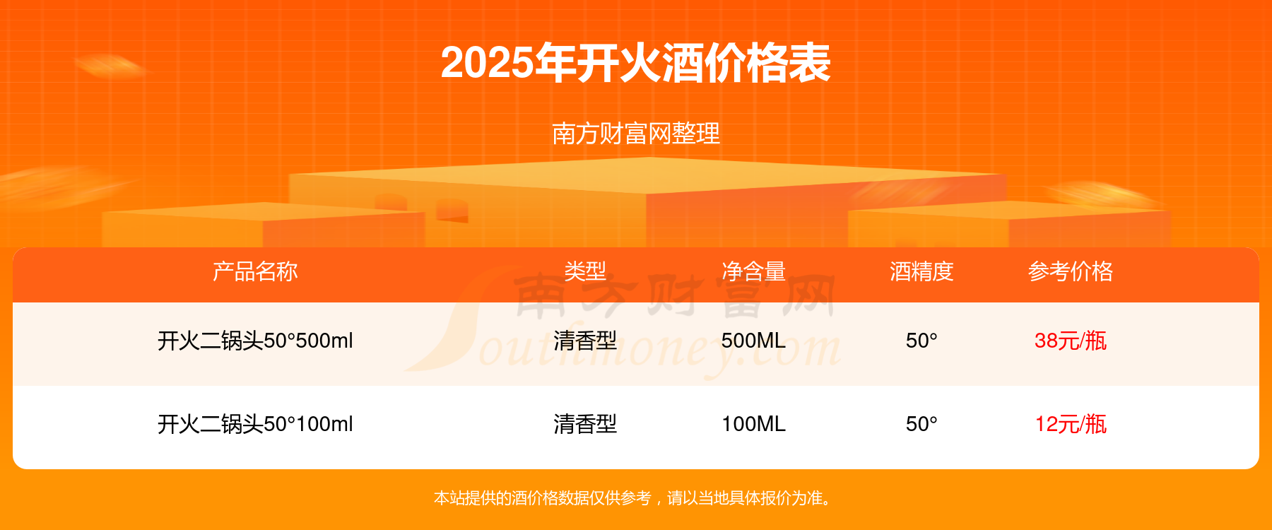 2025年,開火二鍋頭50°500ml、開火二鍋頭50°100ml等開火酒價(jià)格如下:開火二鍋頭50°500ml參考價(jià)38元/瓶、開火二鍋頭50°100ml參考價(jià)12元/瓶。
