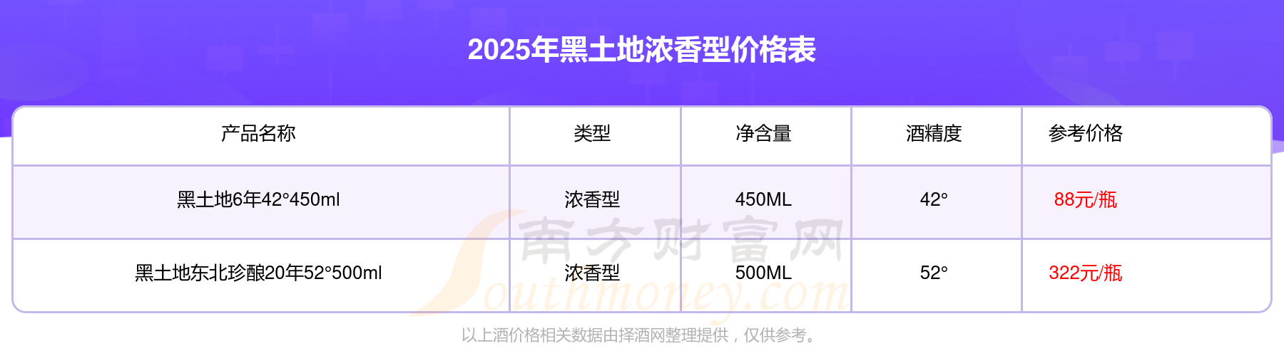 2025年,黑土地東北珍釀20年52°500ml、黑土地6年42°450ml等黑土地濃香型酒價(jià)格如下:黑土地東北珍釀20年52°500ml參考價(jià)322元/瓶、黑土地6年42°450ml參考價(jià)88元/瓶。