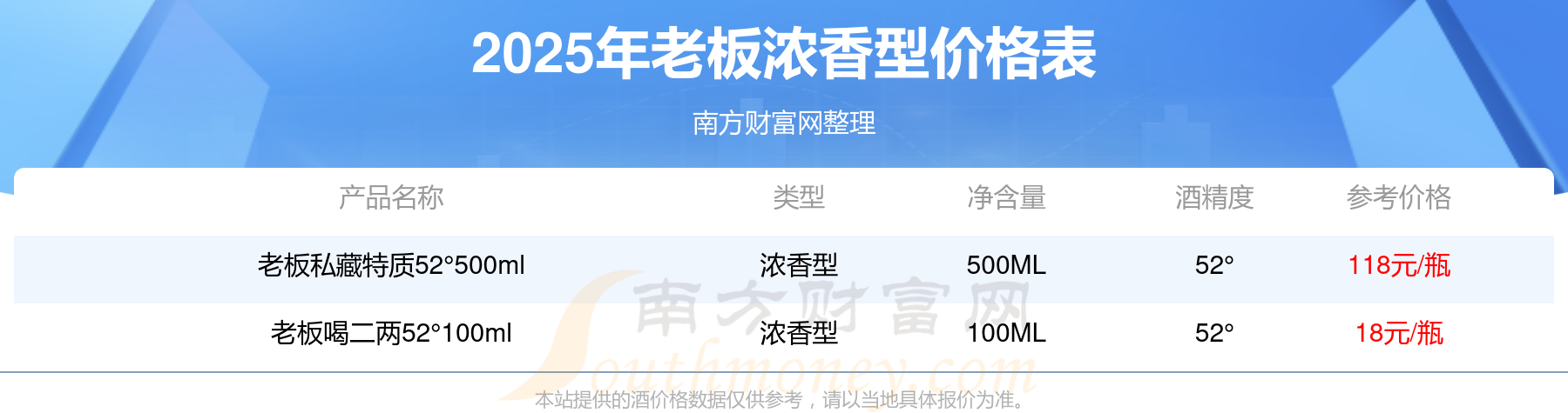 2025年老板濃香型酒 老板私藏特質(zhì)52°500ml、老板喝二兩52°100ml等最新價(jià)格如下: