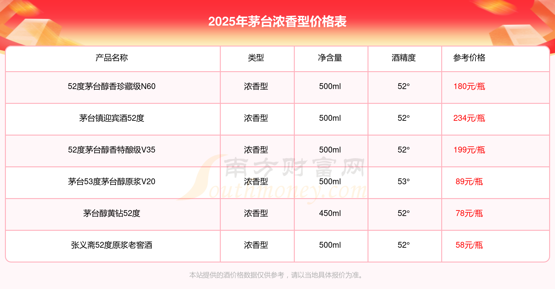 2025年茅臺(tái)濃香型酒茅臺(tái)鎮(zhèn)迎賓酒52度、52度茅臺(tái)醇香特釀級(jí)V35、52度茅臺(tái)醇香珍藏級(jí)N60等最新價(jià)格如下:茅臺(tái)鎮(zhèn)迎賓酒52度參考價(jià)234元/瓶、52度茅臺(tái)醇香特釀級(jí)V35參考價(jià)199元/瓶、52度茅臺(tái)醇香珍藏級(jí)N60參考價(jià)180元/瓶。