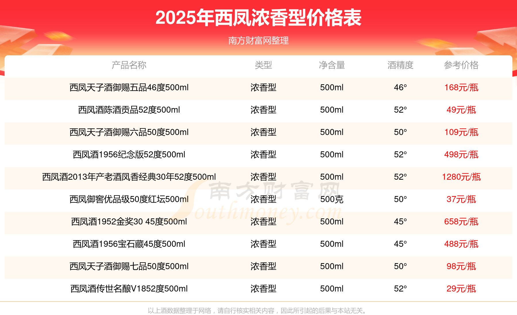 西鳳濃香型酒最新價(jià)格2025:西鳳酒 酒海私藏55度3000ml參考價(jià)8880元/瓶、西鳳酒1952金獎(jiǎng)50 55度500ml參考價(jià)2380元/瓶、西鳳酒2013年產(chǎn)老酒鳳香經(jīng)典30年52度500ml參考價(jià)1280元/瓶、西鳳酒1952金獎(jiǎng)30 55度500ml參考價(jià)898元/瓶、西鳳酒鳳香經(jīng)典20年52度500ml參考價(jià)768元/瓶、西鳳酒1952金獎(jiǎng)30 45度500ml參考價(jià)658元/瓶、西鳳酒1956紀(jì)念版52度500ml參考價(jià)498元/瓶、西鳳酒1956寶石藏45度500ml參考價(jià)488元/瓶。