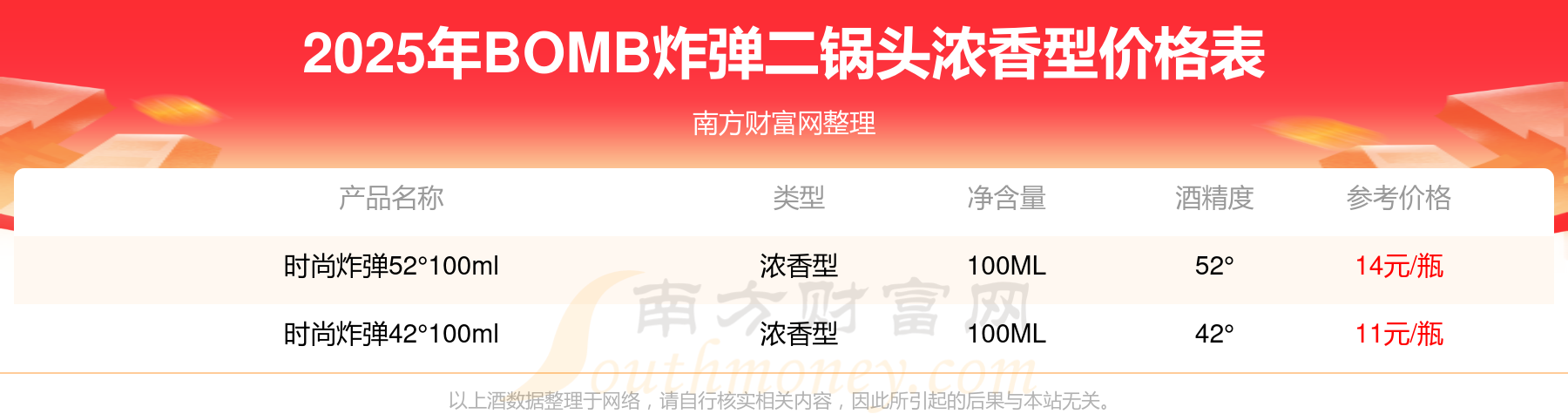 2025年BOMB炸彈二鍋頭濃香型價(jià)格最高的酒是時(shí)尚炸彈52°100ml,參考價(jià)14元/瓶,最低的是時(shí)尚炸彈42°100ml,參考價(jià)11元/瓶,價(jià)格高低差為3元/瓶。