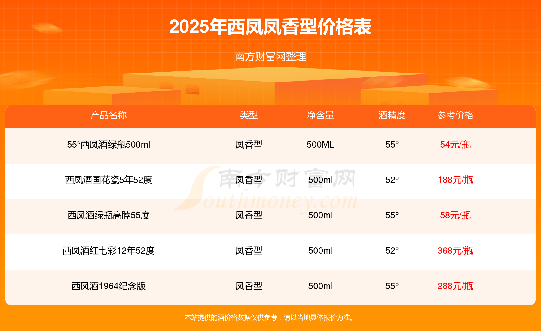 2025年,西鳳鳳香型酒價(jià)格最高的是西鳳酒紅七彩12年52度,參考價(jià)368元,最低的是55°西鳳酒綠瓶500ml,參考價(jià)54元,價(jià)格高低差為314元。