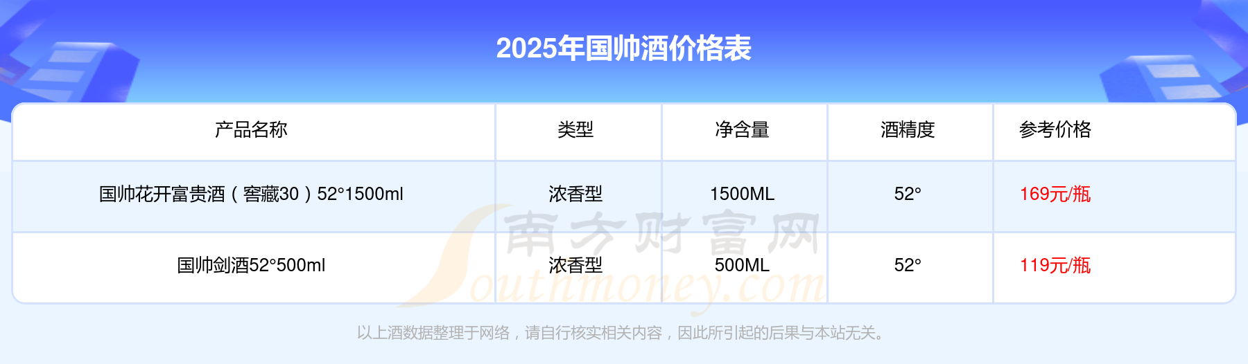 2025年,國(guó)帥花開(kāi)富貴酒(窖藏30)52°1500ml、國(guó)帥劍酒52°500ml等國(guó)帥酒價(jià)格如下:國(guó)帥花開(kāi)富貴酒(窖藏30)52°1500ml參考價(jià)169元/瓶、國(guó)帥劍酒52°500ml參考價(jià)119元/瓶。