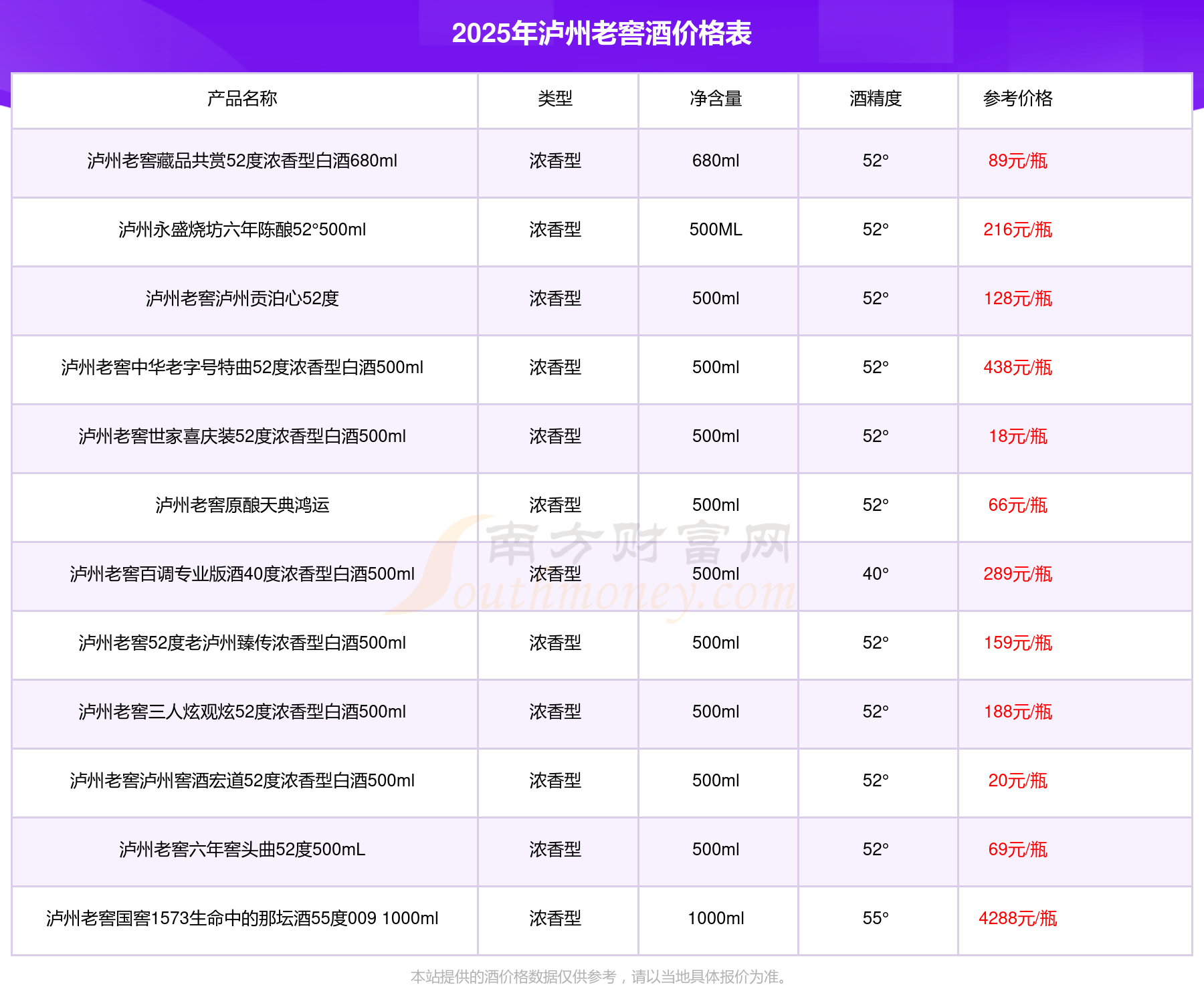 瀘州老窖酒最新價格2025:瀘州老窖國窖1573春釀鼠兆豐年E 55度參考價17999元/瓶、瀘州老窖國窖1573生命中的那壇酒55度014參考價9999元/瓶、瀘州老窖國窖1573春釀鼠兆豐年A 55度參考價5088元/瓶、瀘州老窖國窖1573生命中的那壇酒55度013濃香型白酒1000ml參考價4988元/瓶、瀘州老窖國窖1573生命中的那壇酒55度009 1000ml參考價4288元/瓶、瀘州老窖國窖1573中國品味52度濃香型白酒500ml參考價2888元/瓶、瀘州老窖國窖1573許燎源概念作品58度濃香型白酒1000ml參考價2680元/瓶。