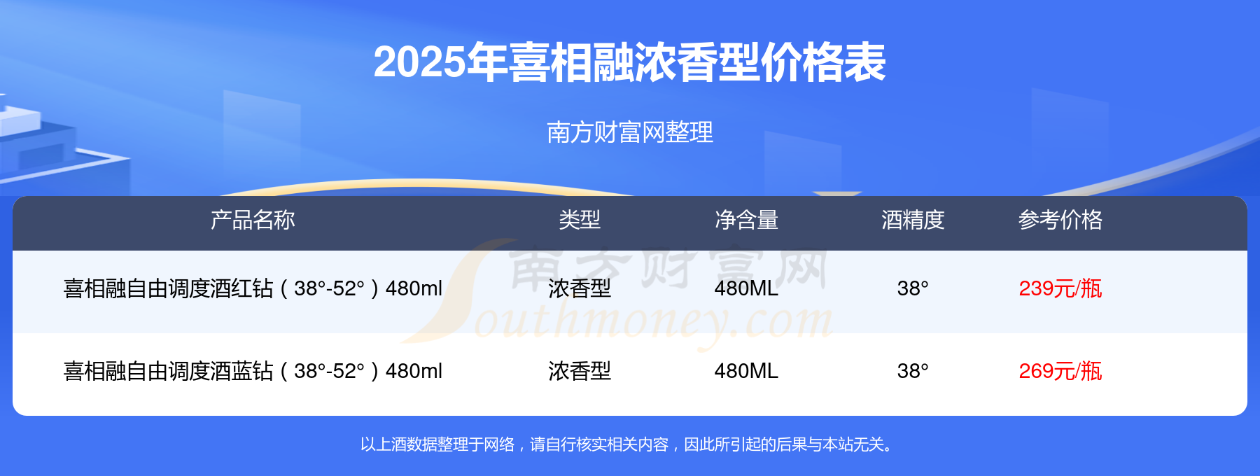 2025年,喜相融自由調(diào)度酒藍(lán)鉆(38°-52°)480ml、喜相融自由調(diào)度酒紅鉆(38°-52°)480ml等喜相融濃香型酒參考價(jià)格如下:喜相融自由調(diào)度酒藍(lán)鉆(38°-52°)480ml參考價(jià)269元、喜相融自由調(diào)度酒紅鉆(38°-52°)480ml參考價(jià)239元。