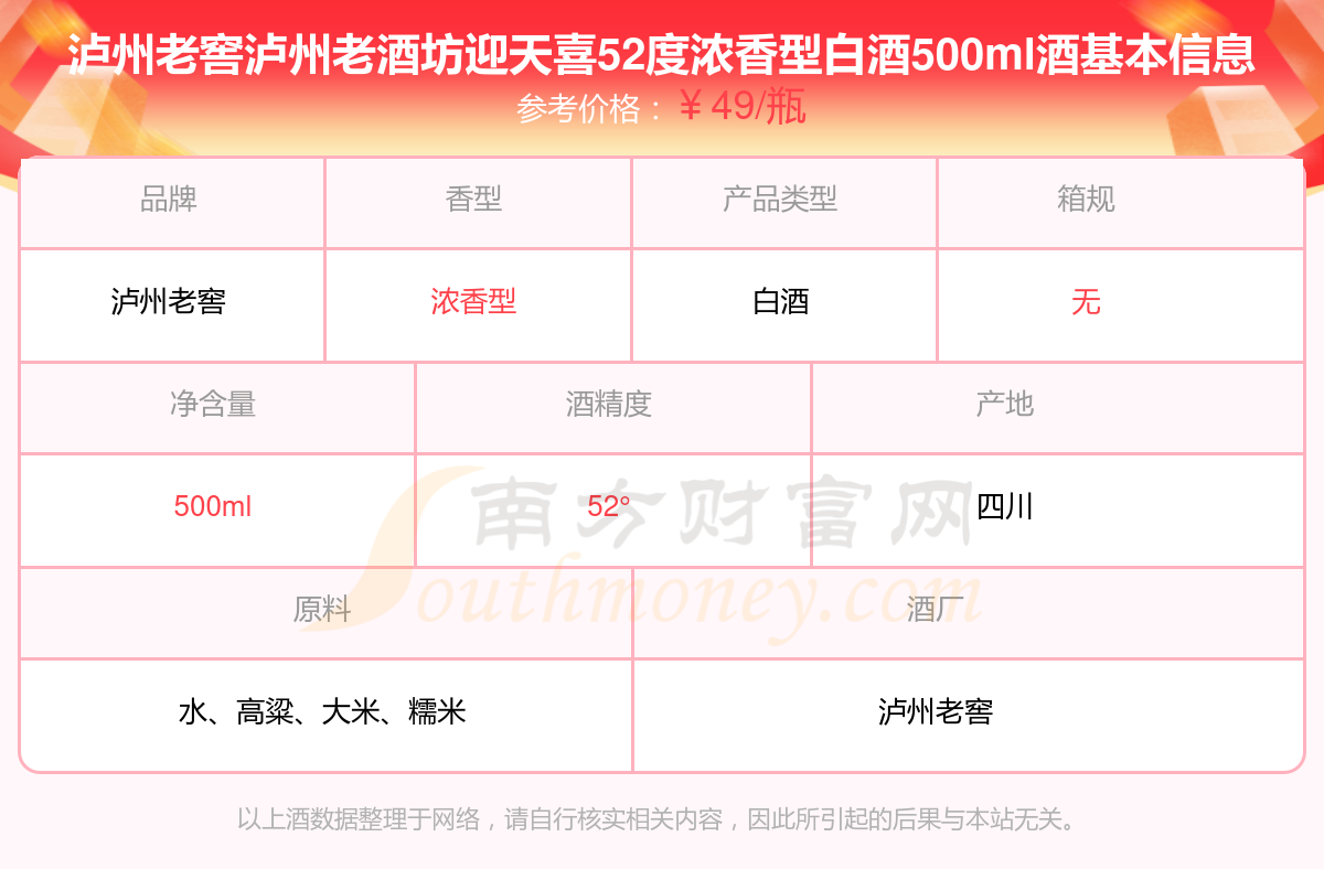 瀘州老窖瀘州老酒坊迎天喜52度濃香型白酒500ml基本信息