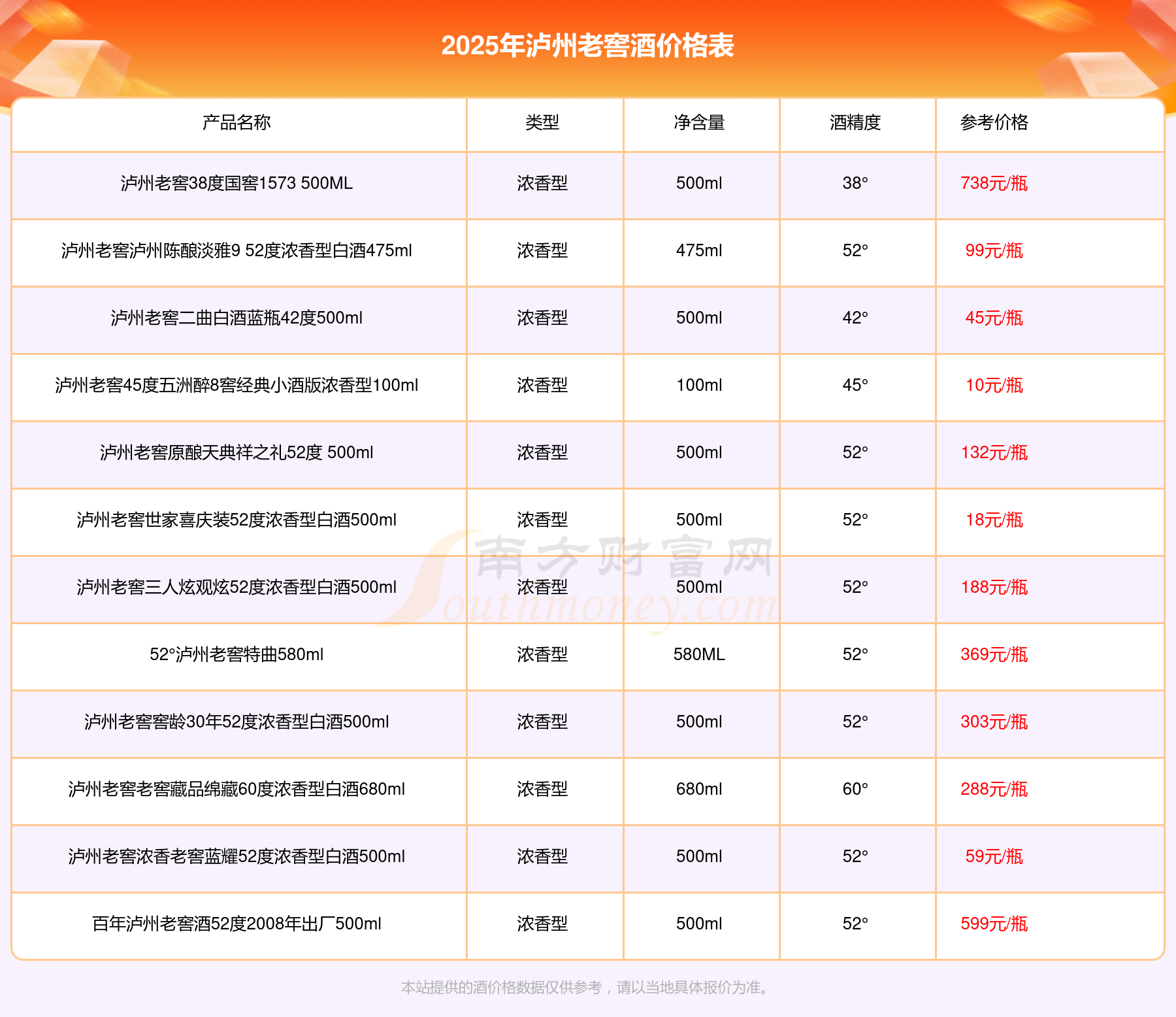 2025年,瀘州老窖國窖1573春釀鼠兆豐年E 55度、瀘州老窖國窖1573生命中的那壇酒55度014、瀘州老窖國窖1573春釀鼠兆豐年A 55度、瀘州老窖國窖1573生命中的那壇酒55度013濃香型白酒1000ml、瀘州老窖國窖1573生命中的那壇酒55度009 1000ml、瀘州老窖國窖1573中國品味52度濃香型白酒500ml、瀘州老窖國窖1573許燎源概念作品58度濃香型白酒1000ml、瀘州老窖52度國窖1573狗年生肖禮盒等瀘州老窖酒價格如下:瀘州老窖國窖1573春釀鼠兆豐年E 55度參考價17999元/瓶、瀘州老窖國窖1573生命中的那壇酒55度014參考價9999元/瓶、瀘州老窖國窖1573春釀鼠兆豐年A 55度參考價5088元/瓶、瀘州老窖國窖1573生命中的那壇酒55度013濃香型白酒1000ml參考價4988元/瓶、瀘州老窖國窖1573生命中的那壇酒55度009 1000ml參考價4288元/瓶、瀘州老窖國窖1573中國品味52度濃香型白酒500ml參考價2888元/瓶、瀘州老窖國窖1573許燎源概念作品58度濃香型白酒1000ml參考價2680元/瓶、瀘州老窖52度國窖1573狗年生肖禮盒參考價2143元/瓶。