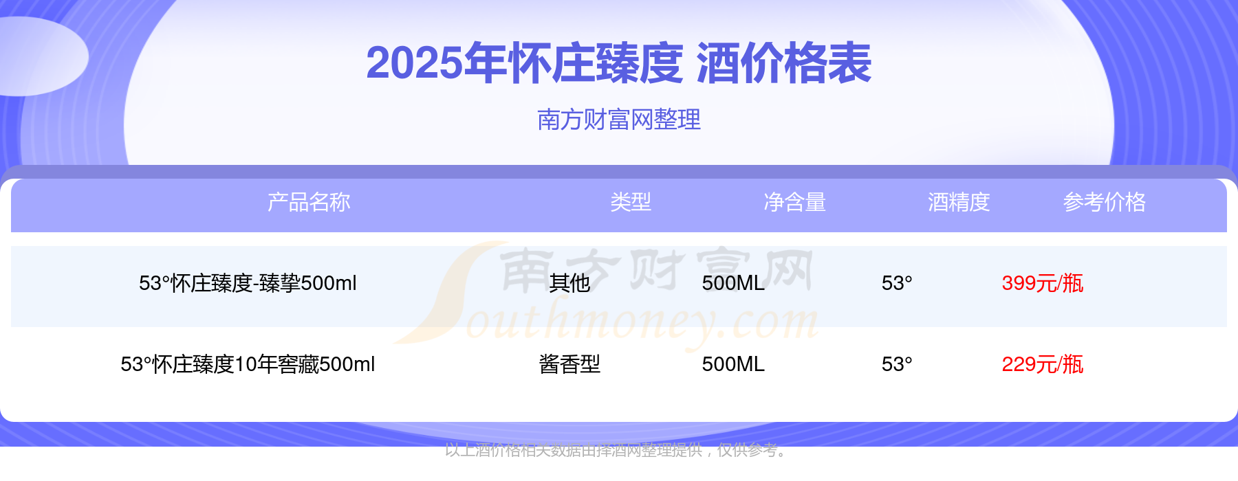 懷莊臻度 酒最新價(jià)格2025:53°懷莊臻度-臻摯500ml參考價(jià)399元/瓶、53°懷莊臻度10年窖藏500ml參考價(jià)229元/瓶。