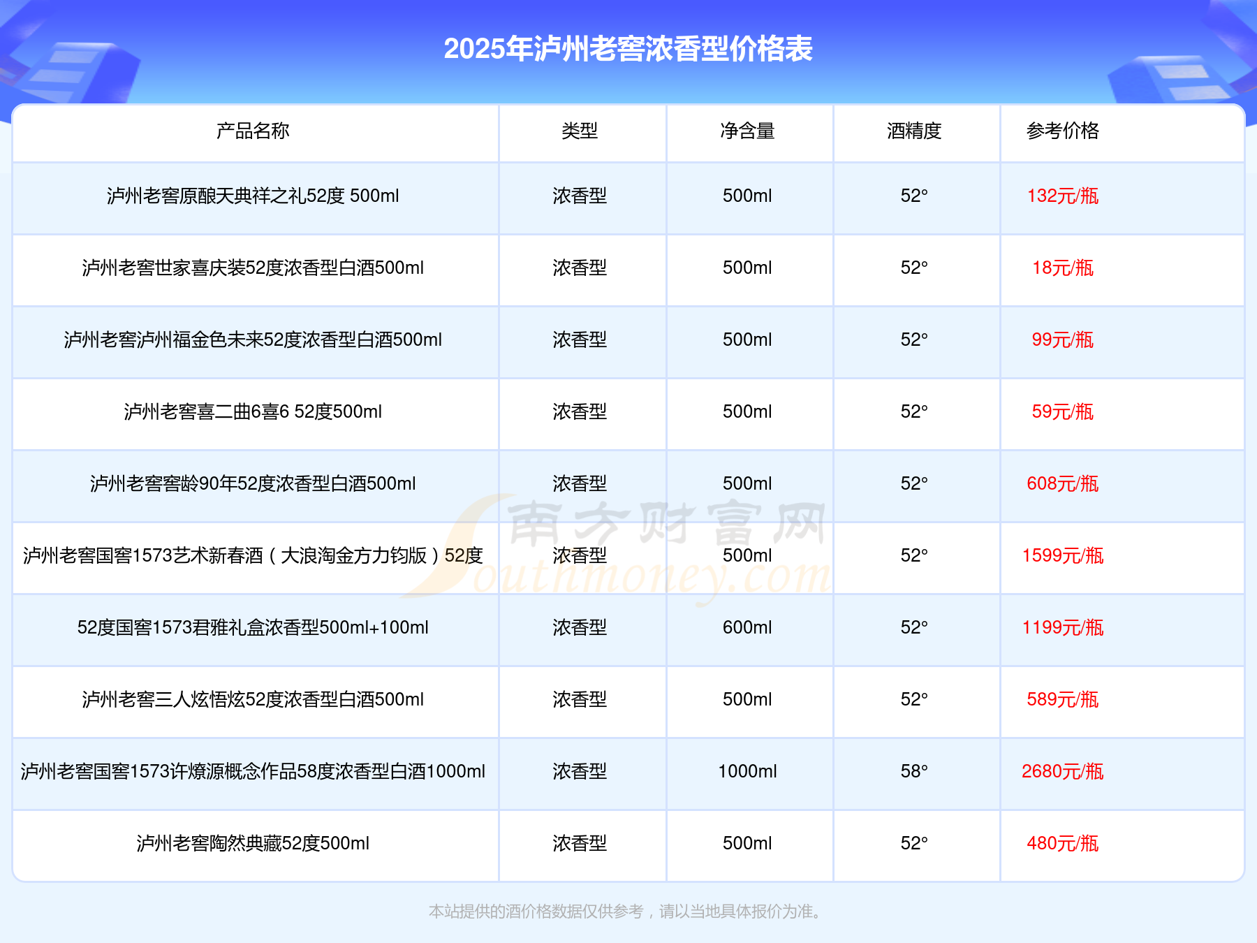 2025年,瀘州老窖國(guó)窖1573春釀鼠兆豐年E 55度、瀘州老窖國(guó)窖1573生命中的那壇酒55度014、瀘州老窖國(guó)窖1573春釀鼠兆豐年A 55度、瀘州老窖國(guó)窖1573生命中的那壇酒55度013濃香型白酒1000ml、瀘州老窖國(guó)窖1573生命中的那壇酒55度009 1000ml、瀘州老窖國(guó)窖1573中國(guó)品味52度濃香型白酒500ml、瀘州老窖國(guó)窖1573許燎源概念作品58度濃香型白酒1000ml等瀘州老窖濃香型酒參考價(jià)格如下:瀘州老窖國(guó)窖1573春釀鼠兆豐年E 55度參考價(jià)17999元、瀘州老窖國(guó)窖1573生命中的那壇酒55度014參考價(jià)9999元、瀘州老窖國(guó)窖1573春釀鼠兆豐年A 55度參考價(jià)5088元、瀘州老窖國(guó)窖1573生命中的那壇酒55度013濃香型白酒1000ml參考價(jià)4988元、瀘州老窖國(guó)窖1573生命中的那壇酒55度009 1000ml參考價(jià)4288元、瀘州老窖國(guó)窖1573中國(guó)品味52度濃香型白酒500ml參考價(jià)2888元、瀘州老窖國(guó)窖1573許燎源概念作品58度濃香型白酒1000ml參考價(jià)2680元。