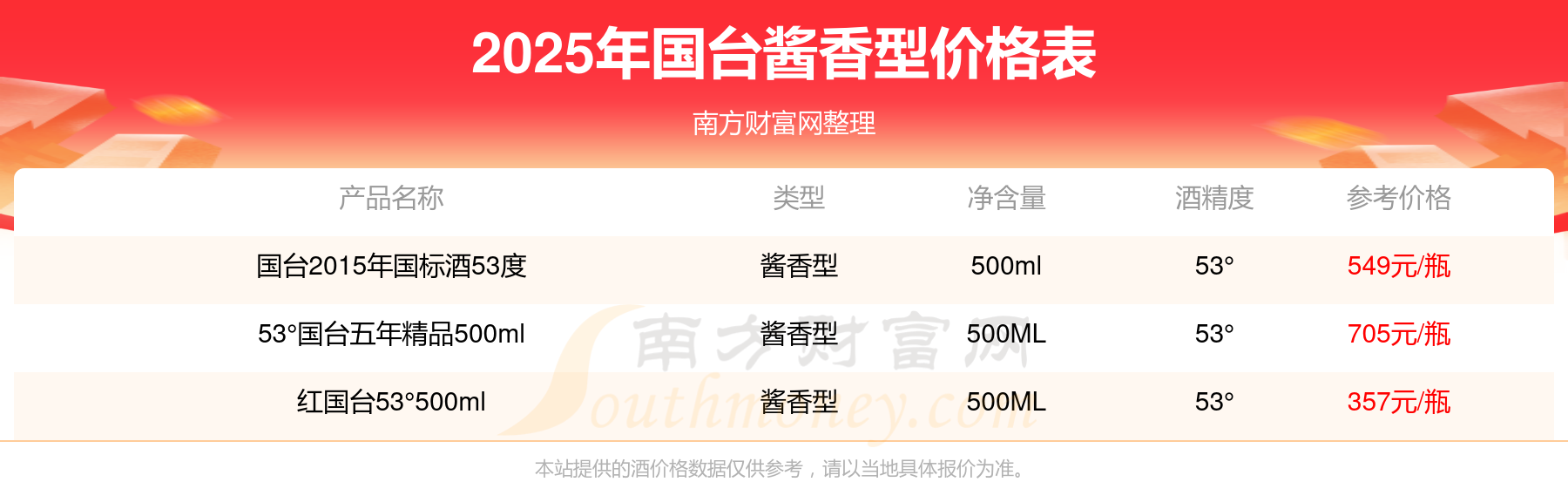 53°國臺五年精品500ml參考價705元/瓶、國臺2015年國標(biāo)酒53度參考價549元/瓶、紅國臺53°500ml參考價357元/瓶。