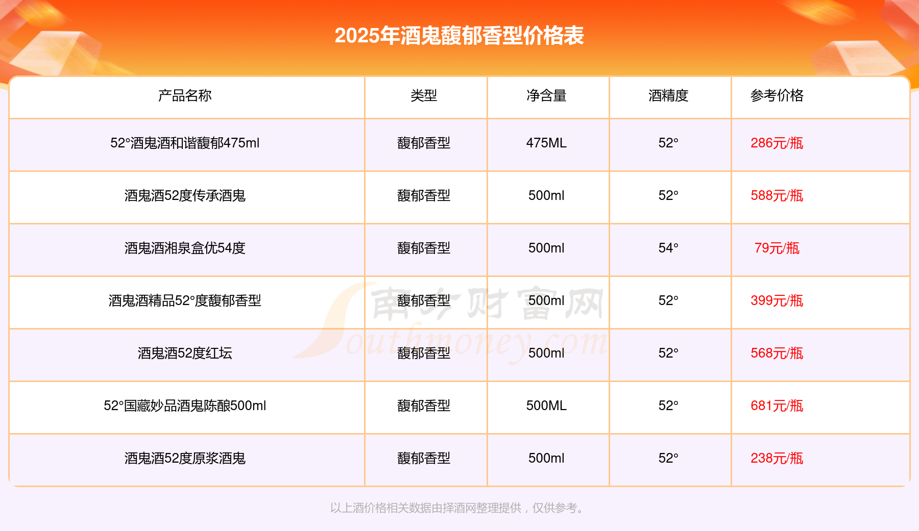 52°國藏妙品酒鬼陳釀500ml參考價681元/瓶、酒鬼酒52度傳承酒鬼參考價588元/瓶、酒鬼酒52度紅壇參考價568元/瓶、酒鬼酒精品52°度馥郁香型參考價399元/瓶、52°酒鬼酒和諧馥郁475ml參考價286元/瓶、酒鬼酒52度原漿酒鬼參考價238元/瓶、酒鬼酒湘泉盒優(yōu)54度參考價79元/瓶。