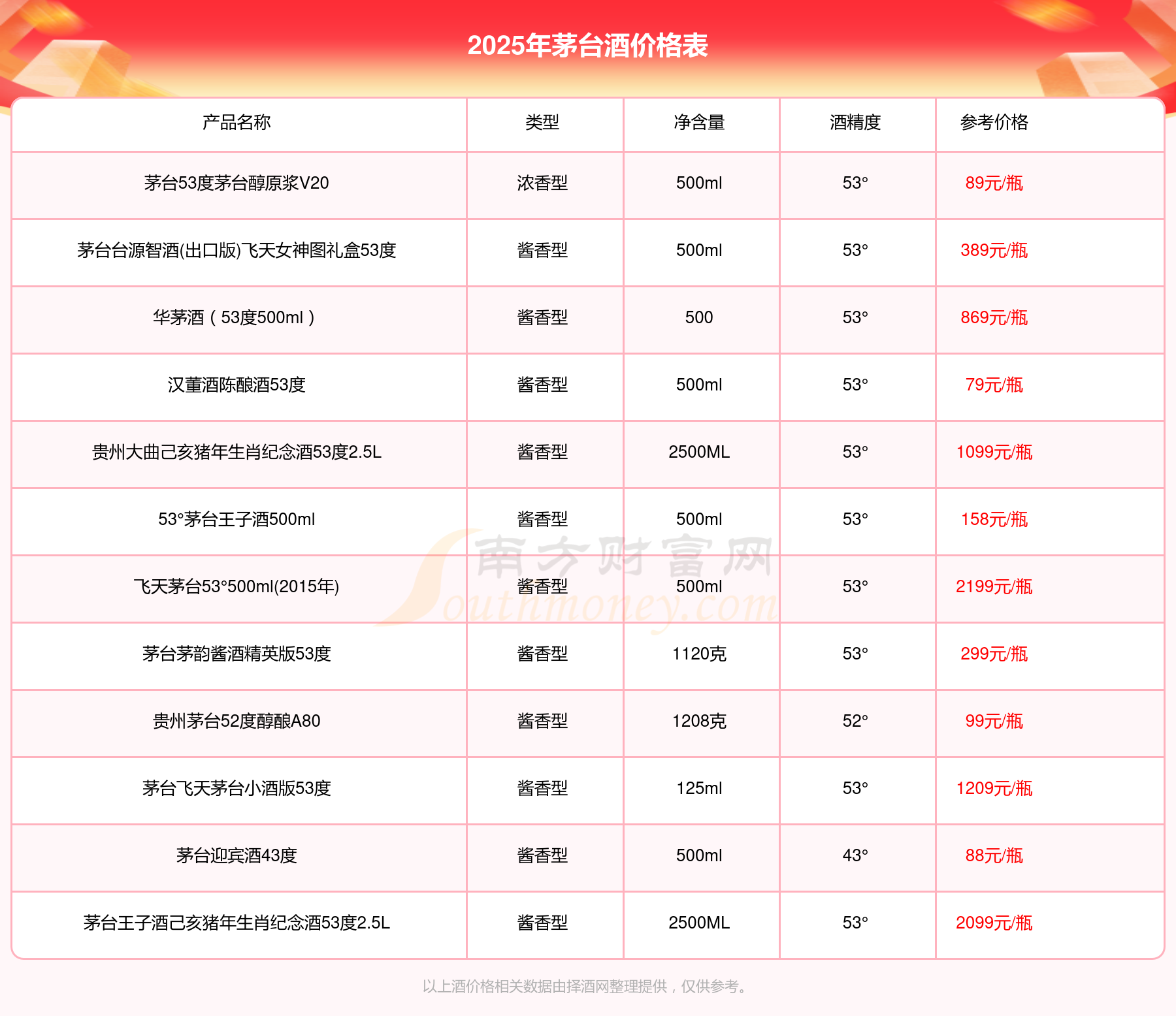 2025年茅臺價格最高的酒是華茅鑒藏 醬香型白酒 3L 53°,參考價8388元/瓶,最低的是張義齋52度原漿老窖酒,參考價58元/瓶,價格高低差為8330元/瓶。