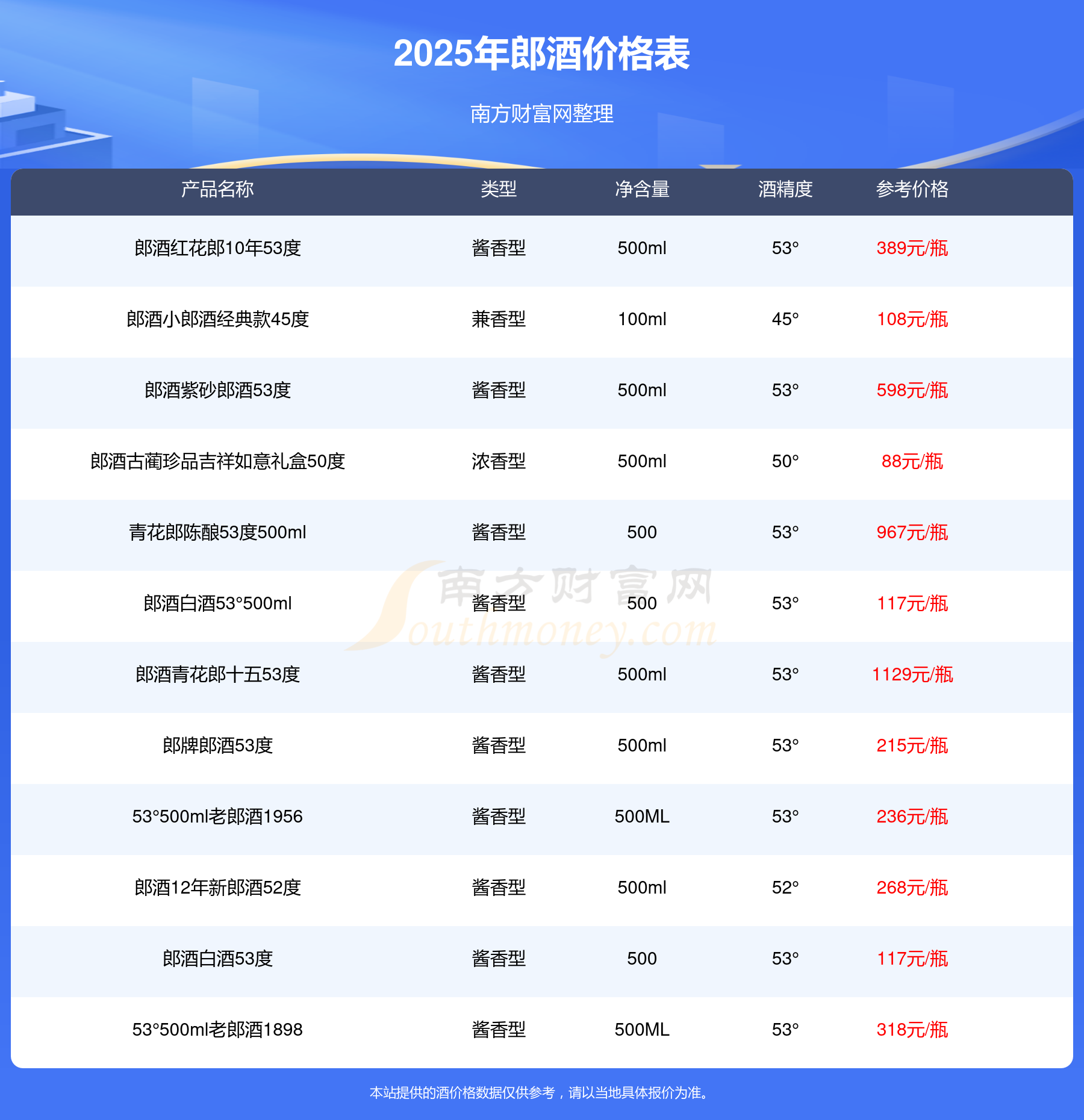 2025郎酒最新價(jià)格:郎酒青花郎十五53度參考價(jià)1129元/瓶、青花郎陳釀53度500ml參考價(jià)967元/瓶、郎酒紫砂郎酒53度參考價(jià)598元/瓶、郎酒紅花郎10年53度參考價(jià)389元/瓶。