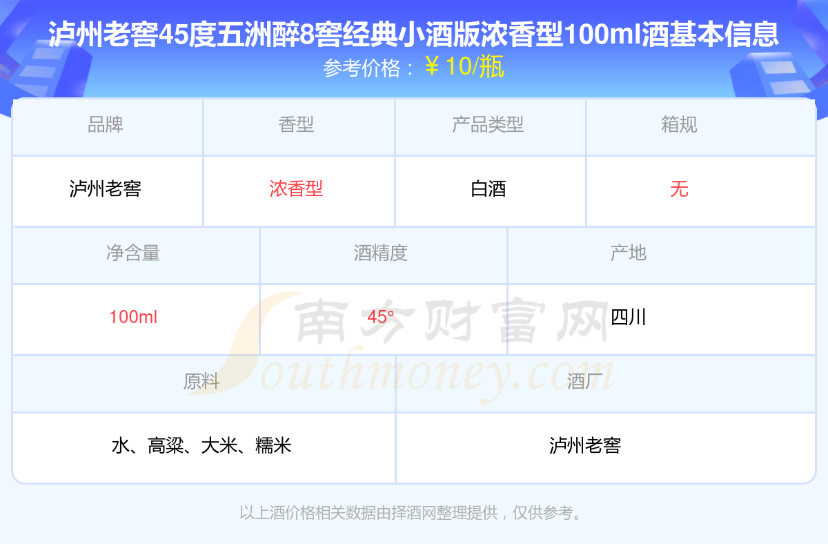 瀘州老窖45度五洲醉8窖經(jīng)典小酒版濃香型100ml基本信息