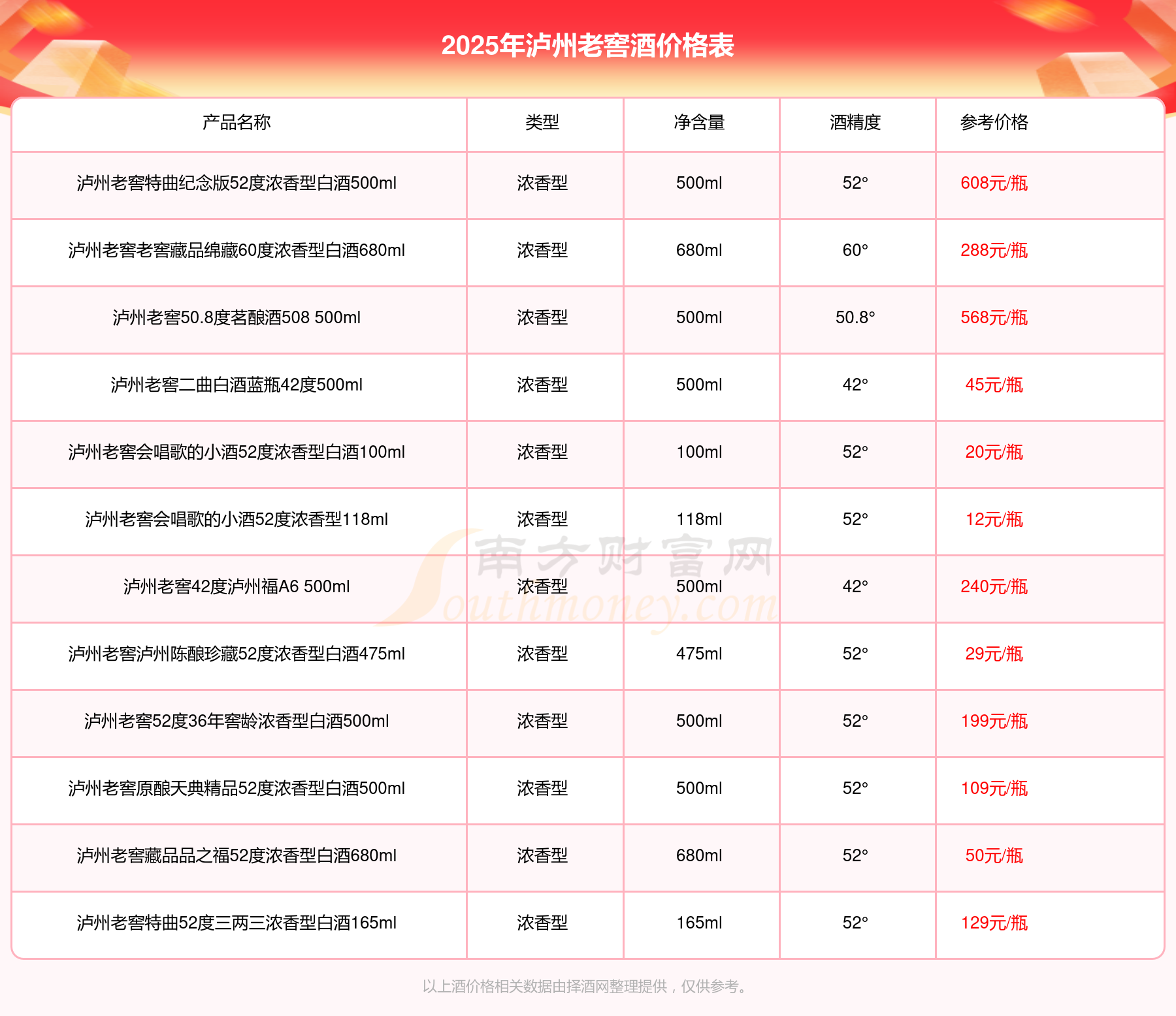 瀘州老窖國窖1573春釀鼠兆豐年E 55度參考價(jià)17999元/瓶、瀘州老窖國窖1573生命中的那壇酒55度014參考價(jià)9999元/瓶、瀘州老窖國窖1573春釀鼠兆豐年A 55度參考價(jià)5088元/瓶、瀘州老窖國窖1573生命中的那壇酒55度013濃香型白酒1000ml參考價(jià)4988元/瓶、瀘州老窖國窖1573生命中的那壇酒55度009 1000ml參考價(jià)4288元/瓶、瀘州老窖國窖1573中國品味52度濃香型白酒500ml參考價(jià)2888元/瓶。