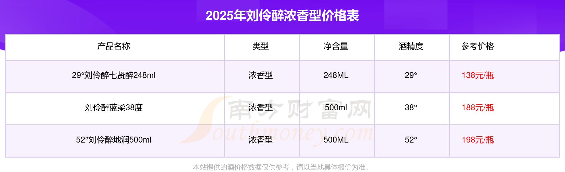 52°劉伶醉地潤500ml參考價198元/瓶、劉伶醉藍柔38度參考價188元/瓶、29°劉伶醉七賢醉248ml參考價138元/瓶。