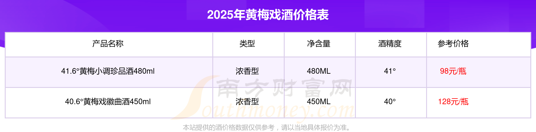 2025年黃梅戲價格最高的酒是40.6°黃梅戲徽曲酒450ml,參考價128元/瓶,最低的是41.6°黃梅小調珍品酒480ml,參考價98元/瓶,價格高低差為30元/瓶。